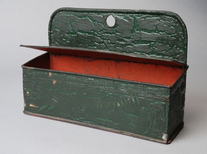 Blikken doos voor spanen, groen geverfd, houtstruktuur