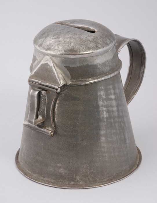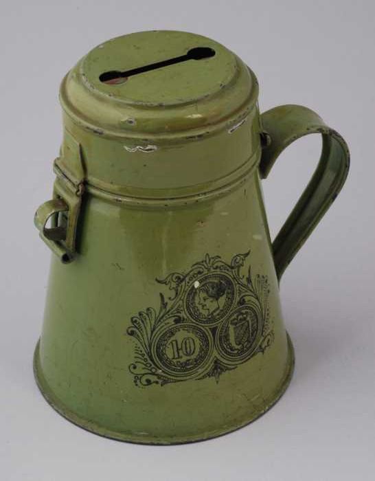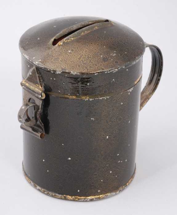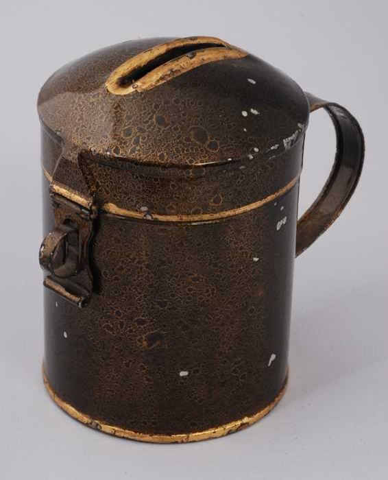 Blikken spaarpot of collectebus met oor en deksel, b...