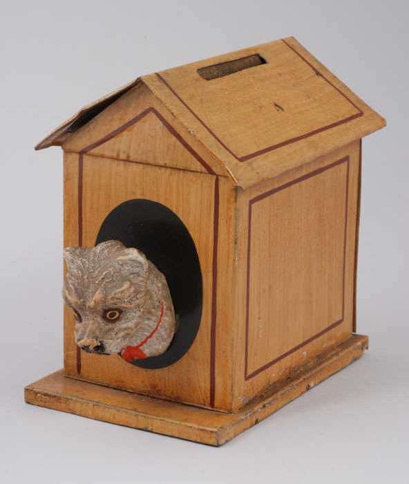 Metalen spaarpot in de vorm van een hondenhok met ho...