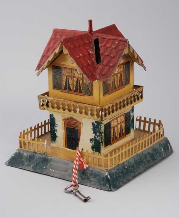 Metalen spaarpot in de vorm van een huis op een grondje