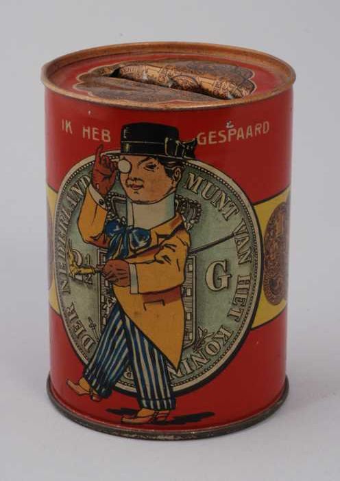 Metalen spaarpot, blik waarop: "IK HEB GESPAARD - IK...
