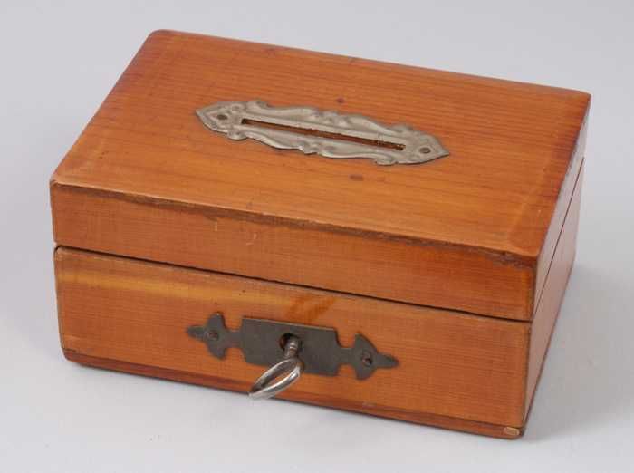 Houten spaarpot, kleine kist met beslag