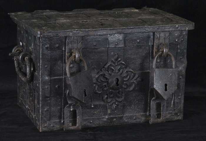 IJzeren geldkist of archiefkist met twee hangsloten