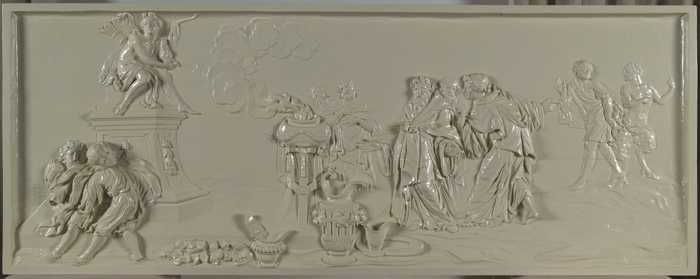 Wit geschilderd, gesneden houten reliëf met de verer...