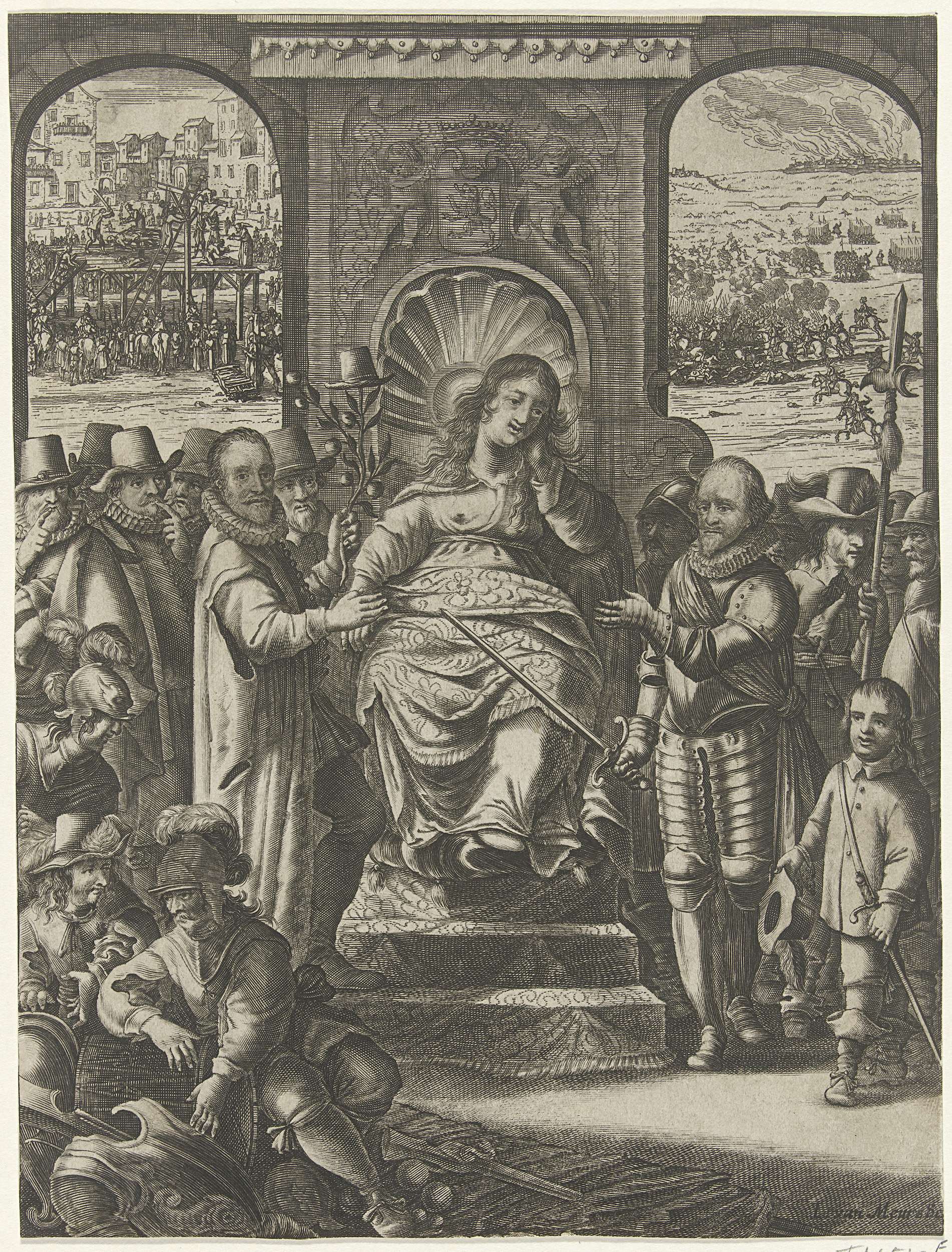 Allegorische titelprent met de Nederlandse Maagd gef...