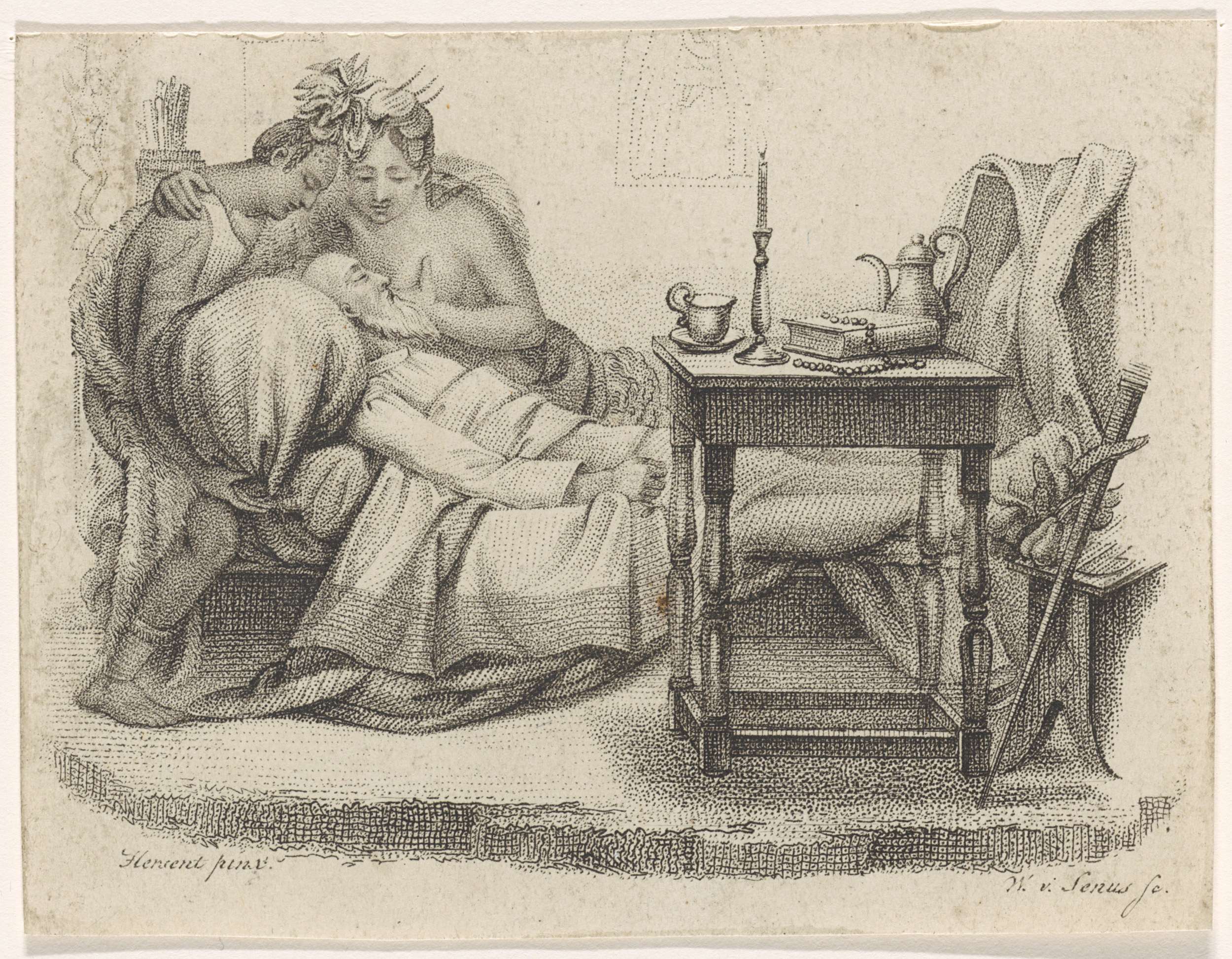 Twee figuren bij het ziekbed van een oude man