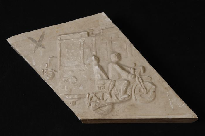 Gipsmodel van straat met tram en motorfiets, fragmen...