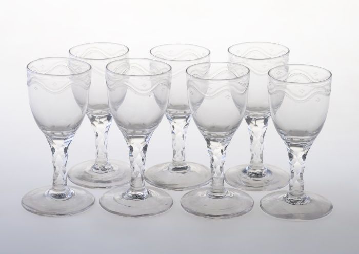 Zeven kelkglazen, wijnglazen met gefacetteerde stam