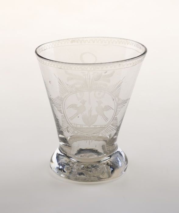 Beker gegraveerd met huwelijkssymbolen, twee vogels ...