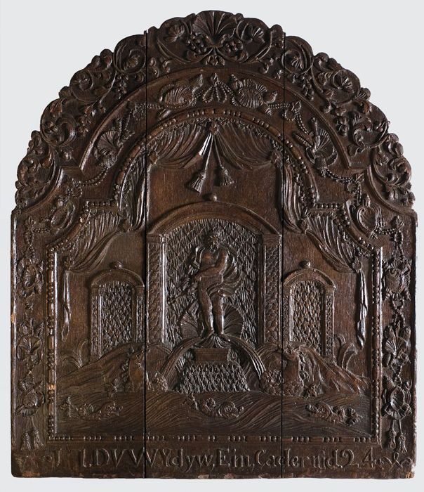 Haardplaat putti met lauwerkrans en tulpen