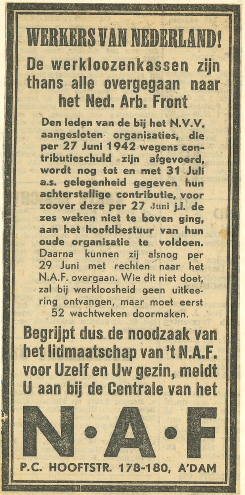 advertentie: Werkers van Nederland!. De werkloozenka...