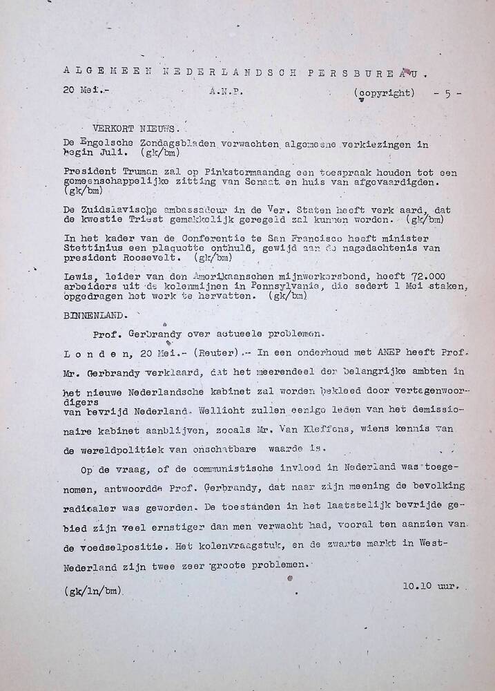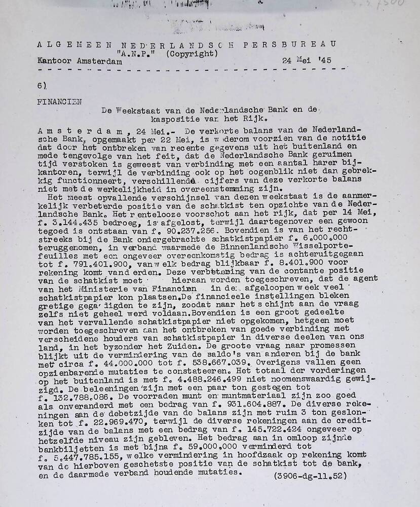 Algemeen Nederlandsch Persbureau, mededelingen, 20 m...