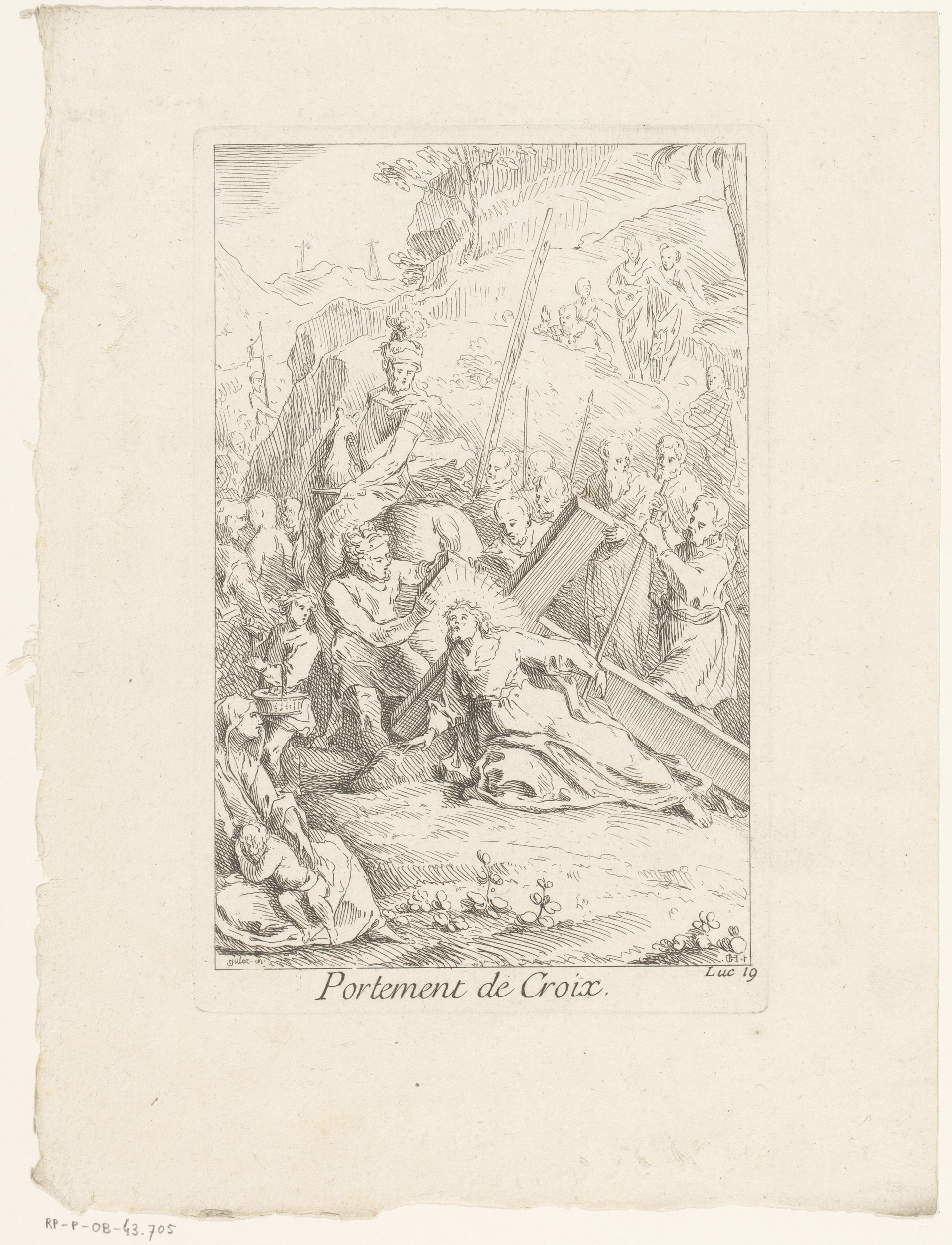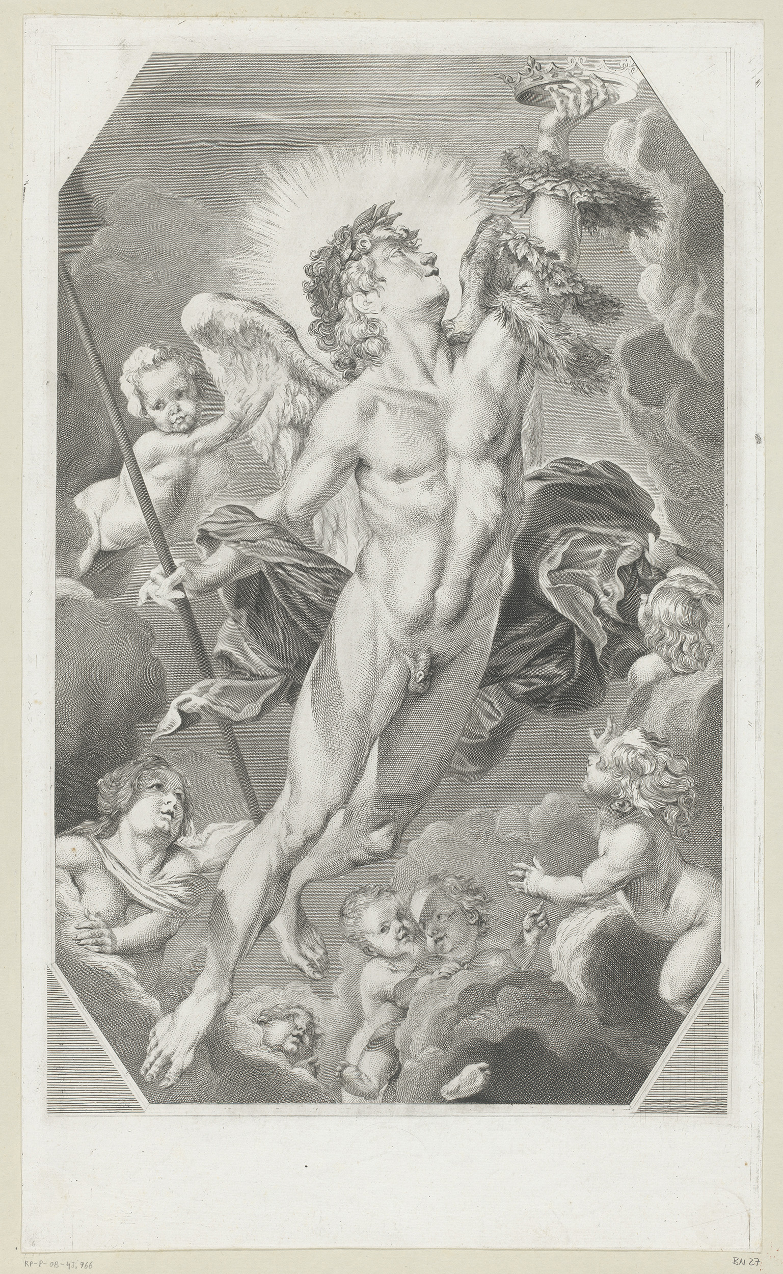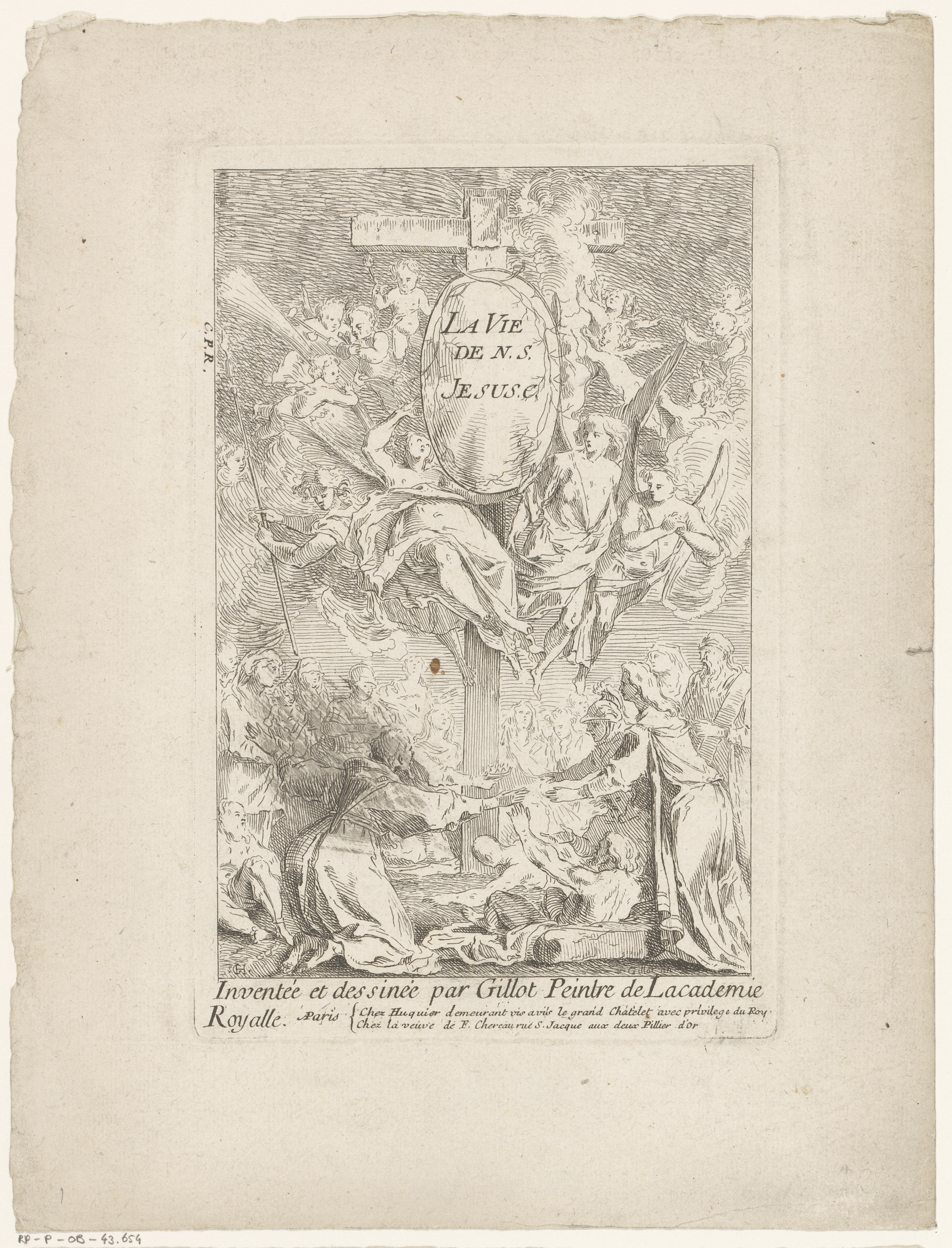 Titelprent met figuren en engelen rond het kruis