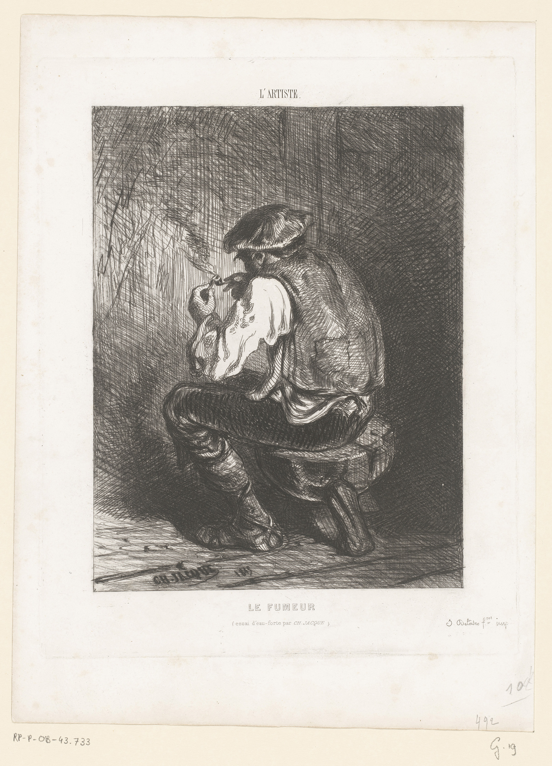 Rokende man op een kruk, op de rug gezien