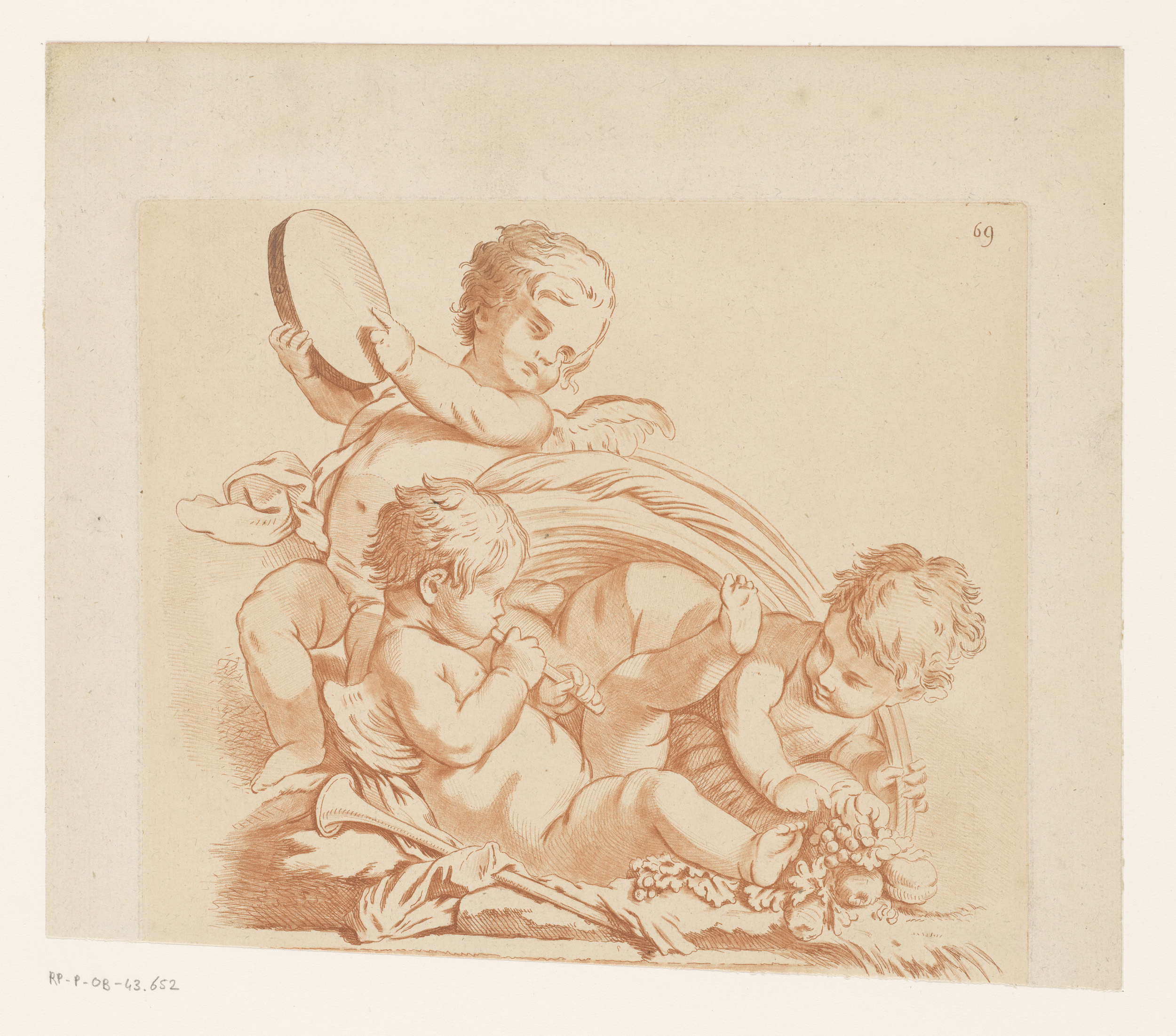 Drie putti met muziekinstrumenten en fruit