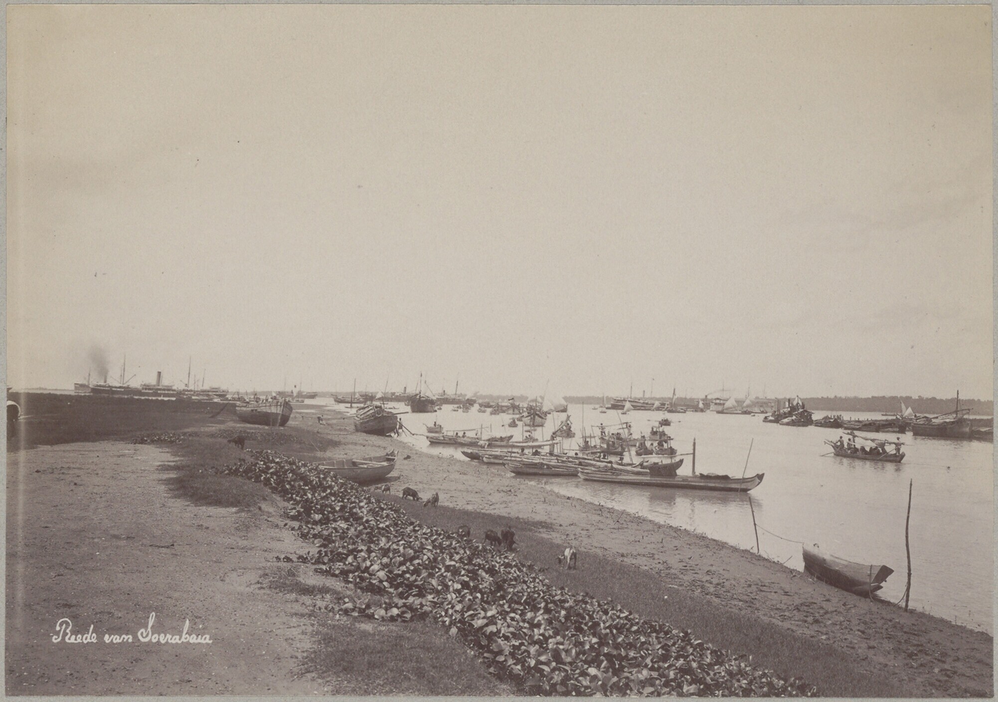 Gezicht vanaf Soerabaja op prauwen langs het strand ...