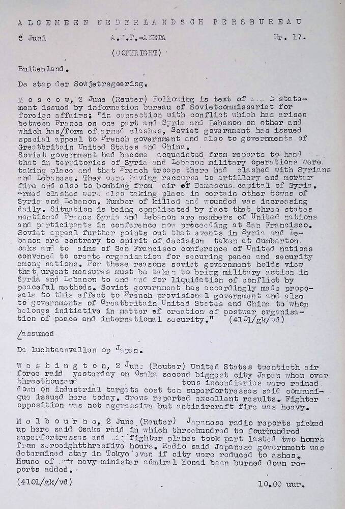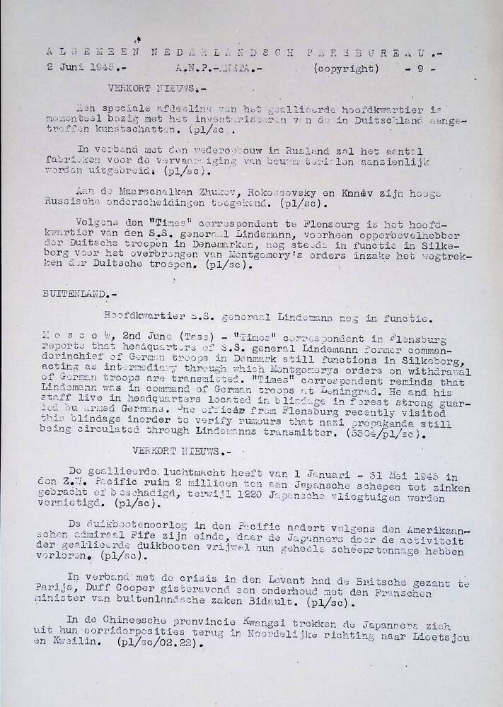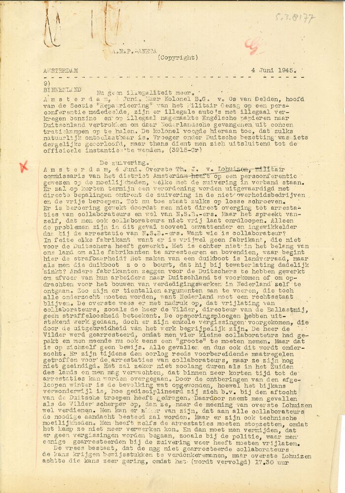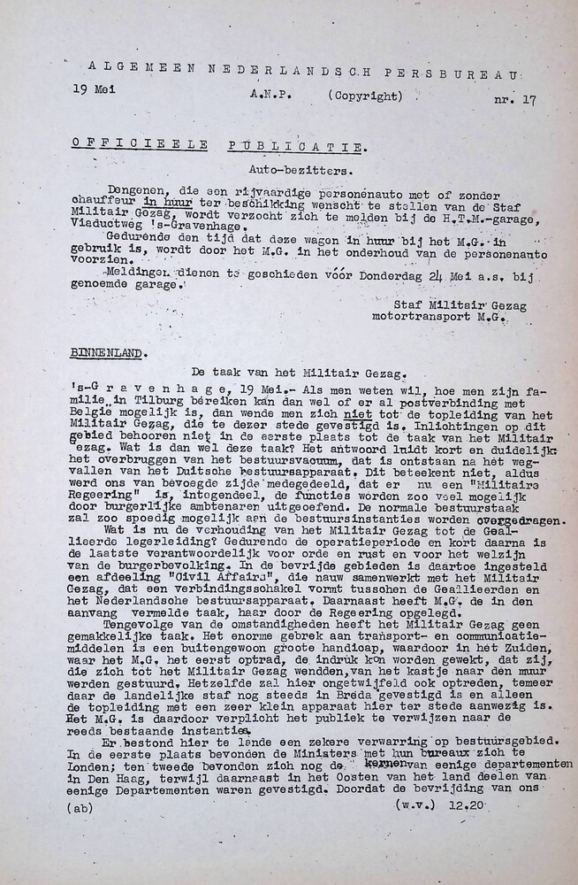 Algemeen Nederlandsch Persbureau, mededelingen, 19 m...