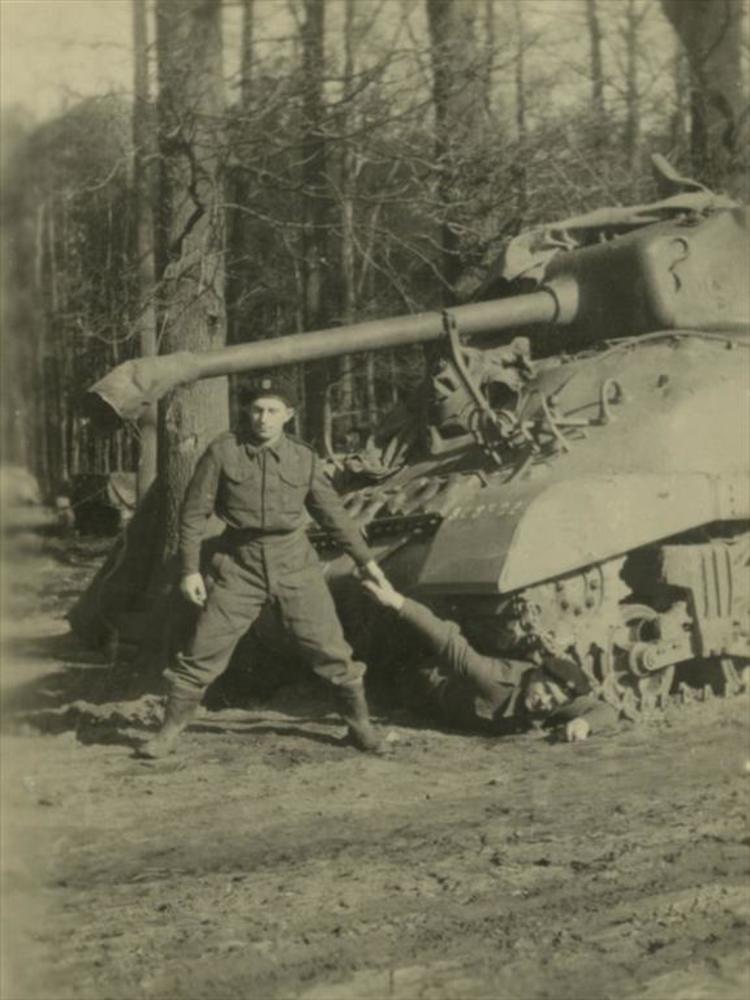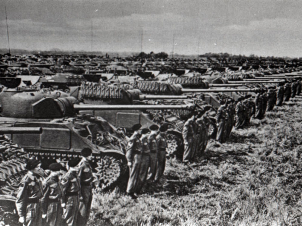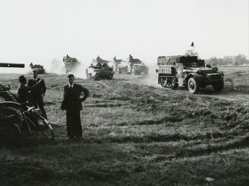 M-3 halftracks, Bren Carrier en Sherman tank nabij N...