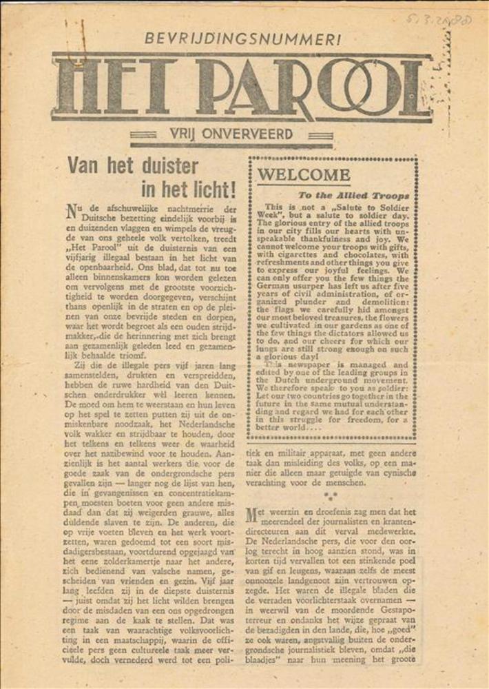 Het Parool, vrij onverveerd, Bevrijdingsnummer, "Van...