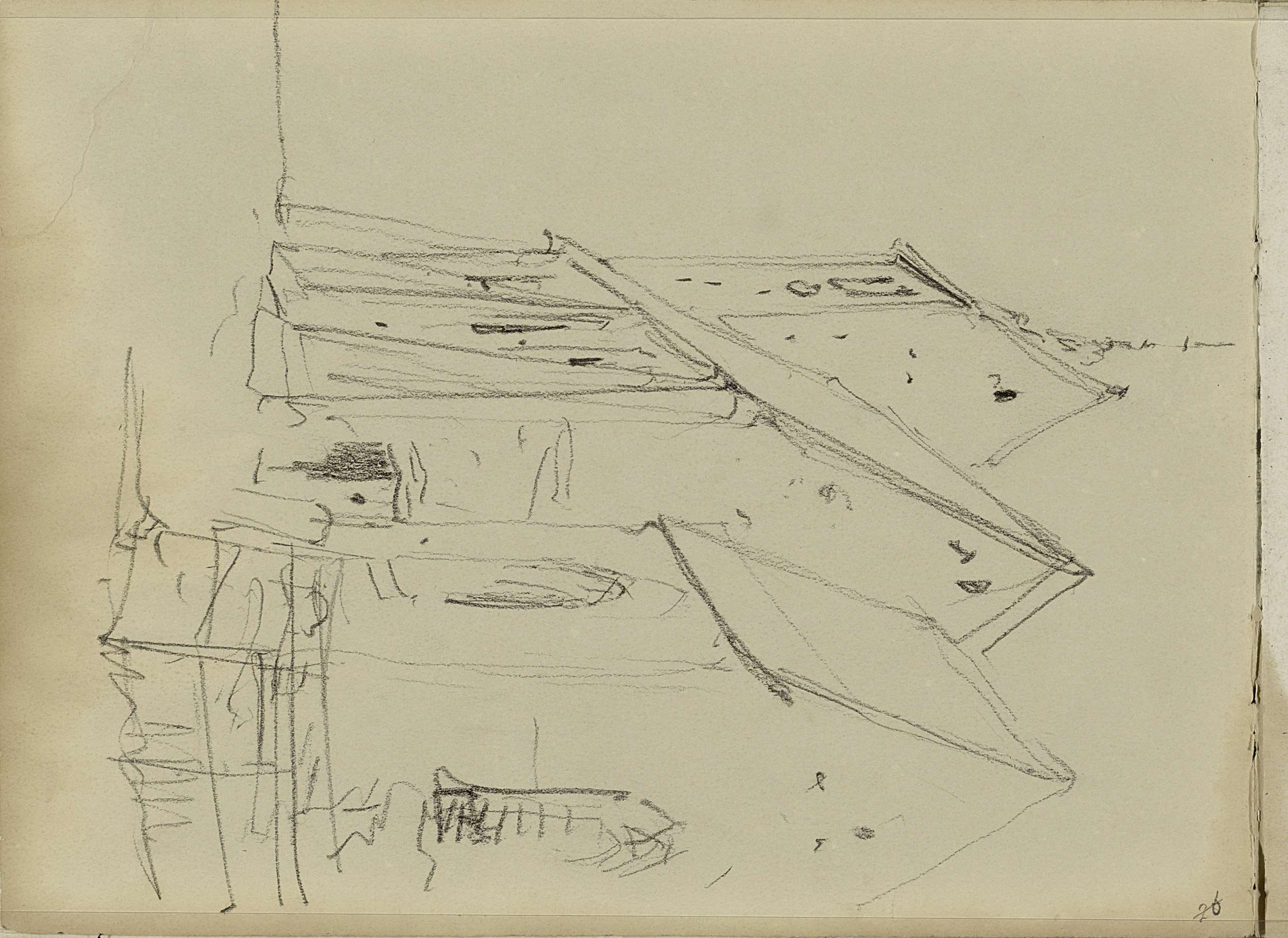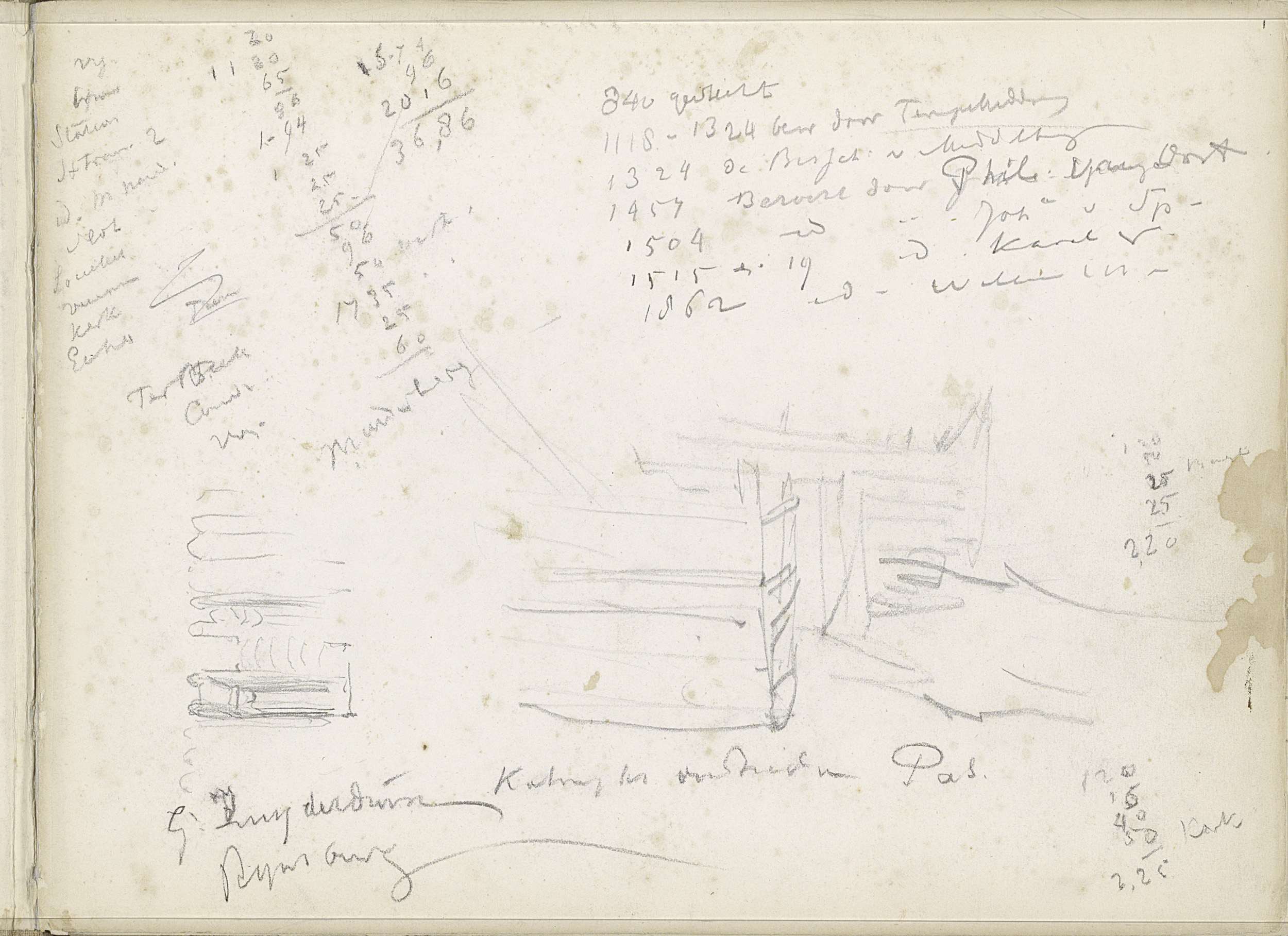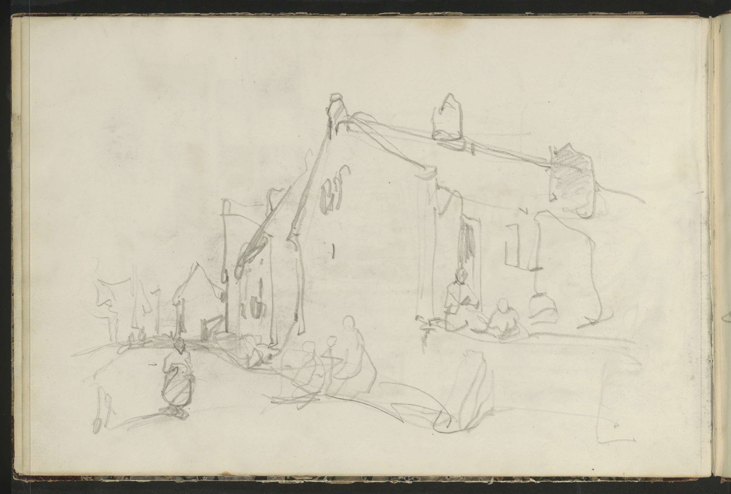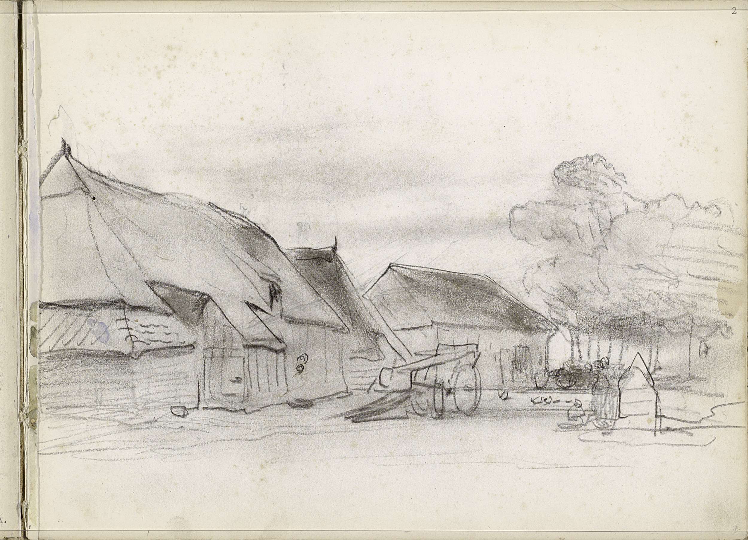Studieblad met een hooischuur, honden en figuren