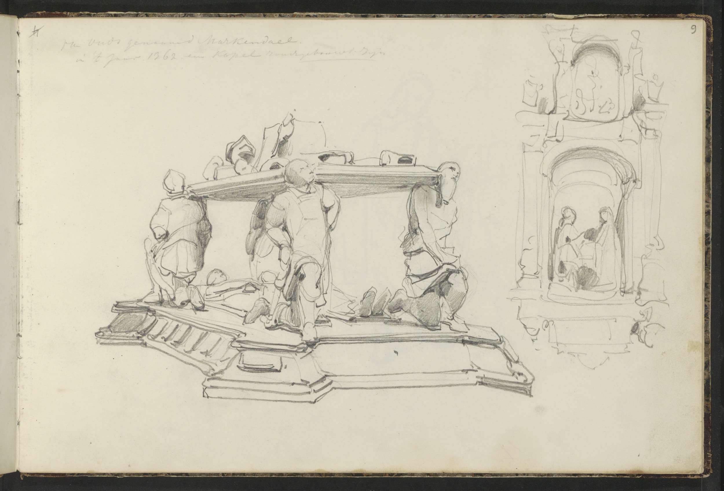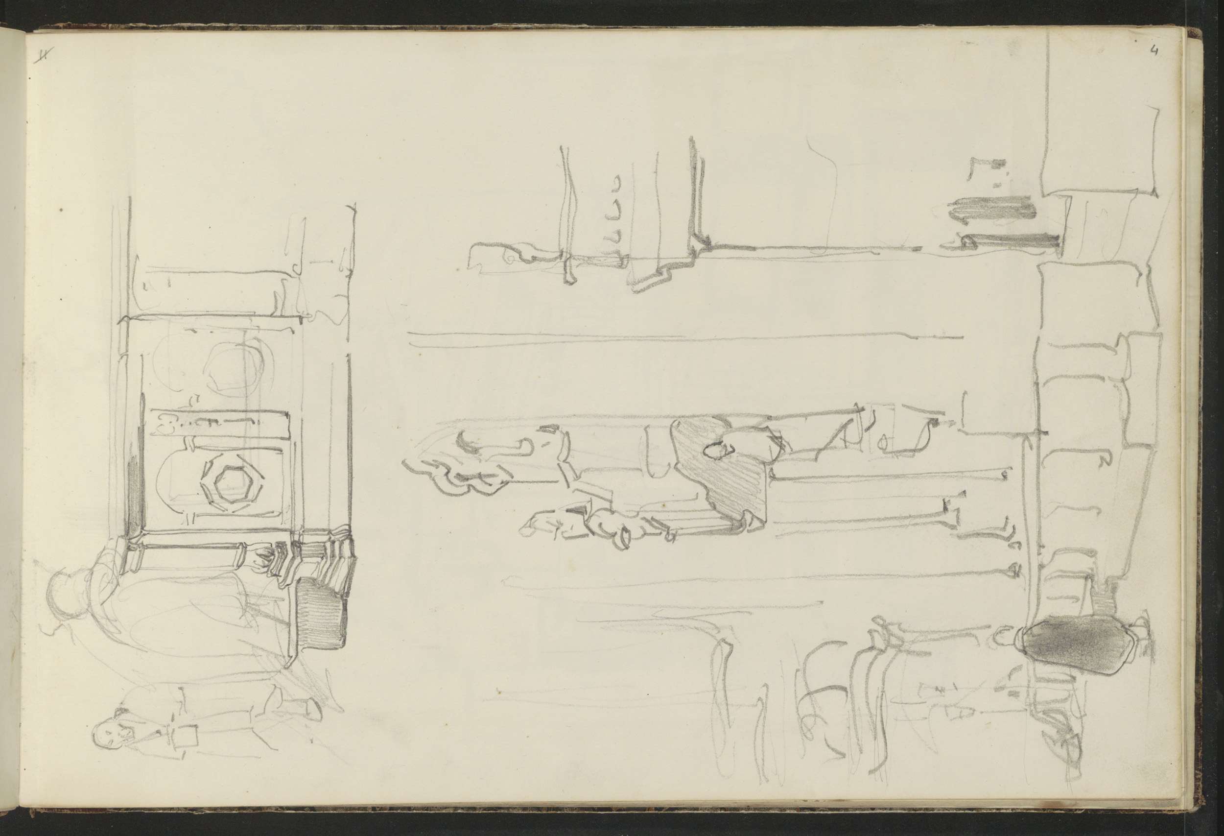 Zittende figuren, vermoedelijk op kerkbanken
