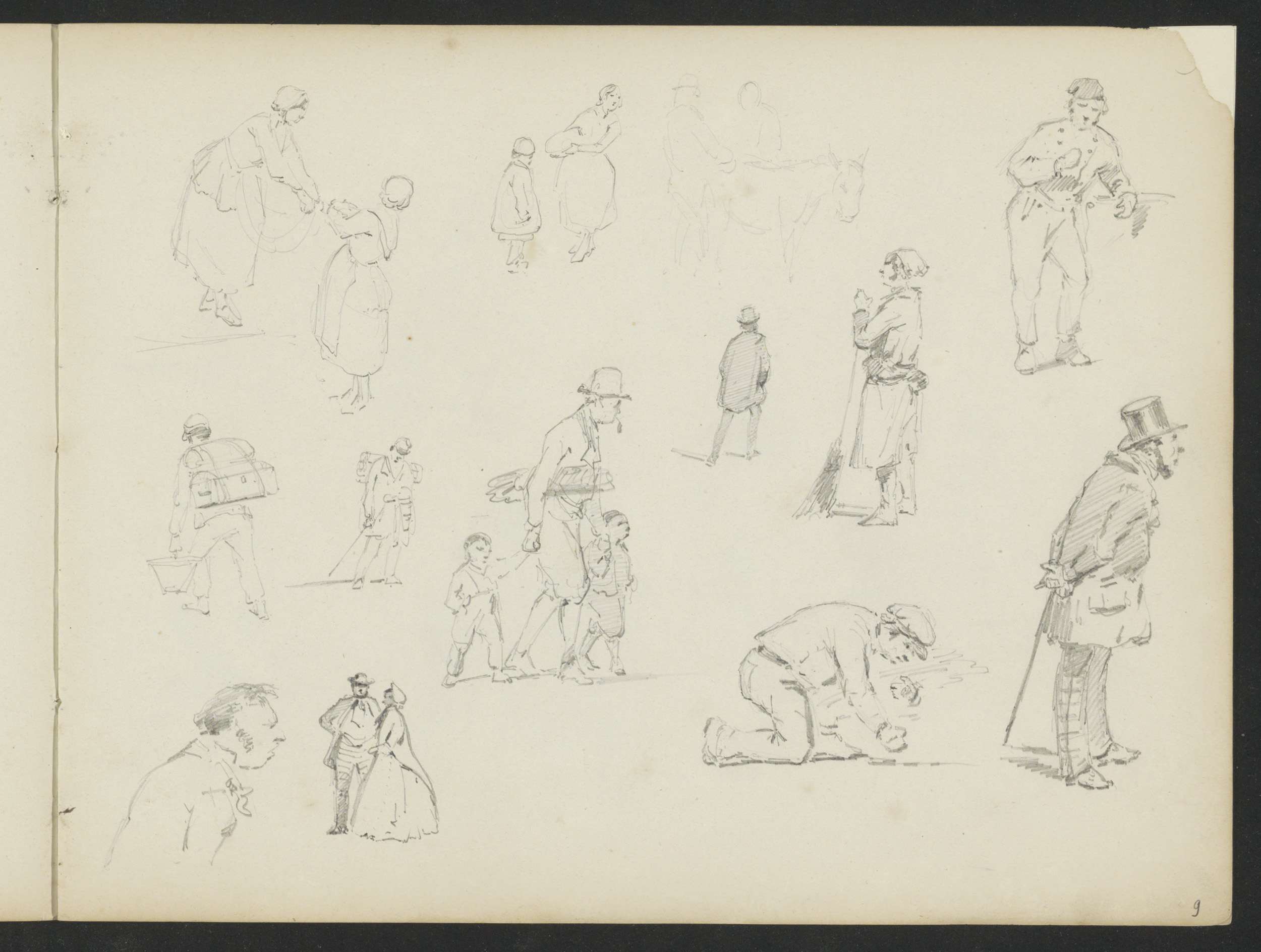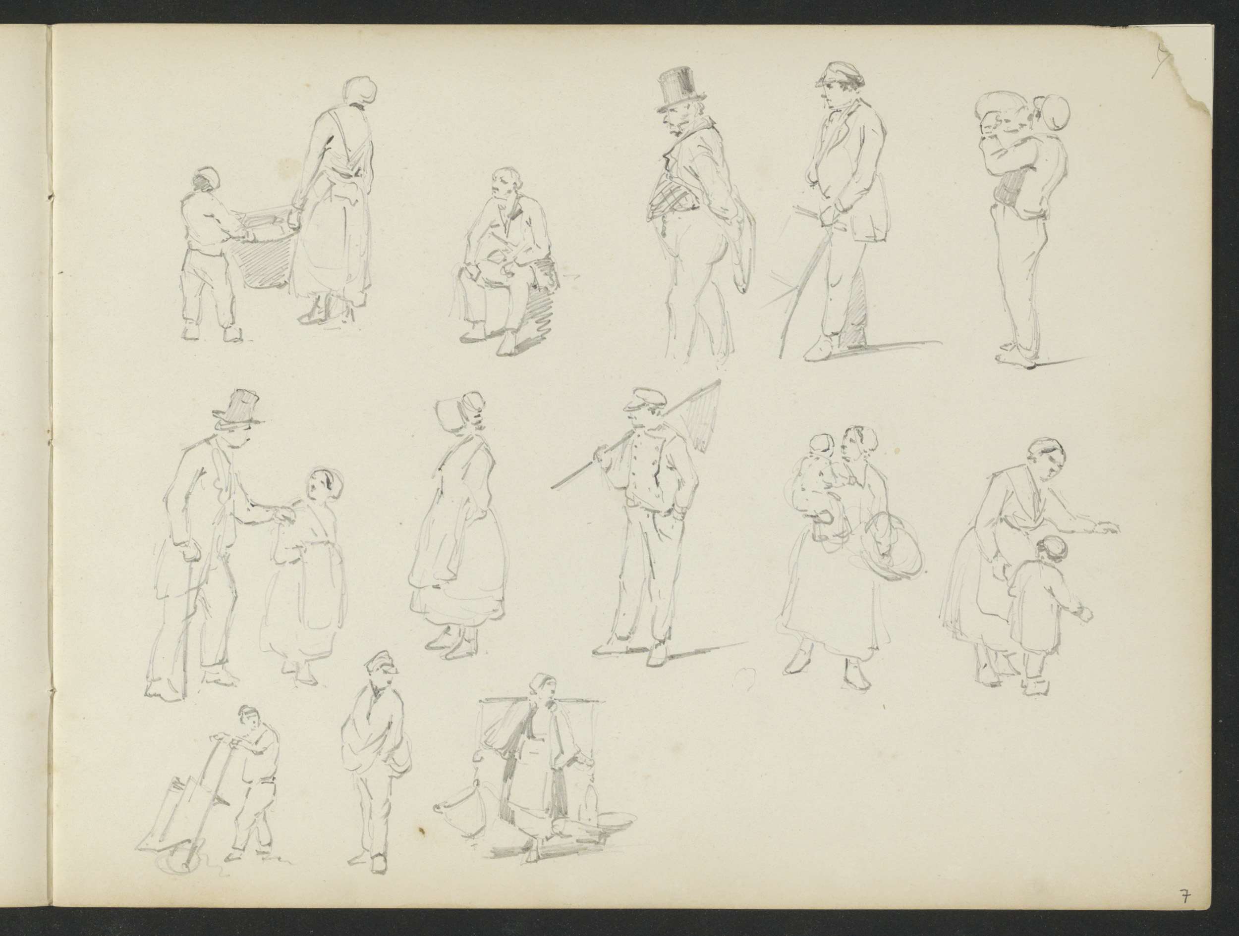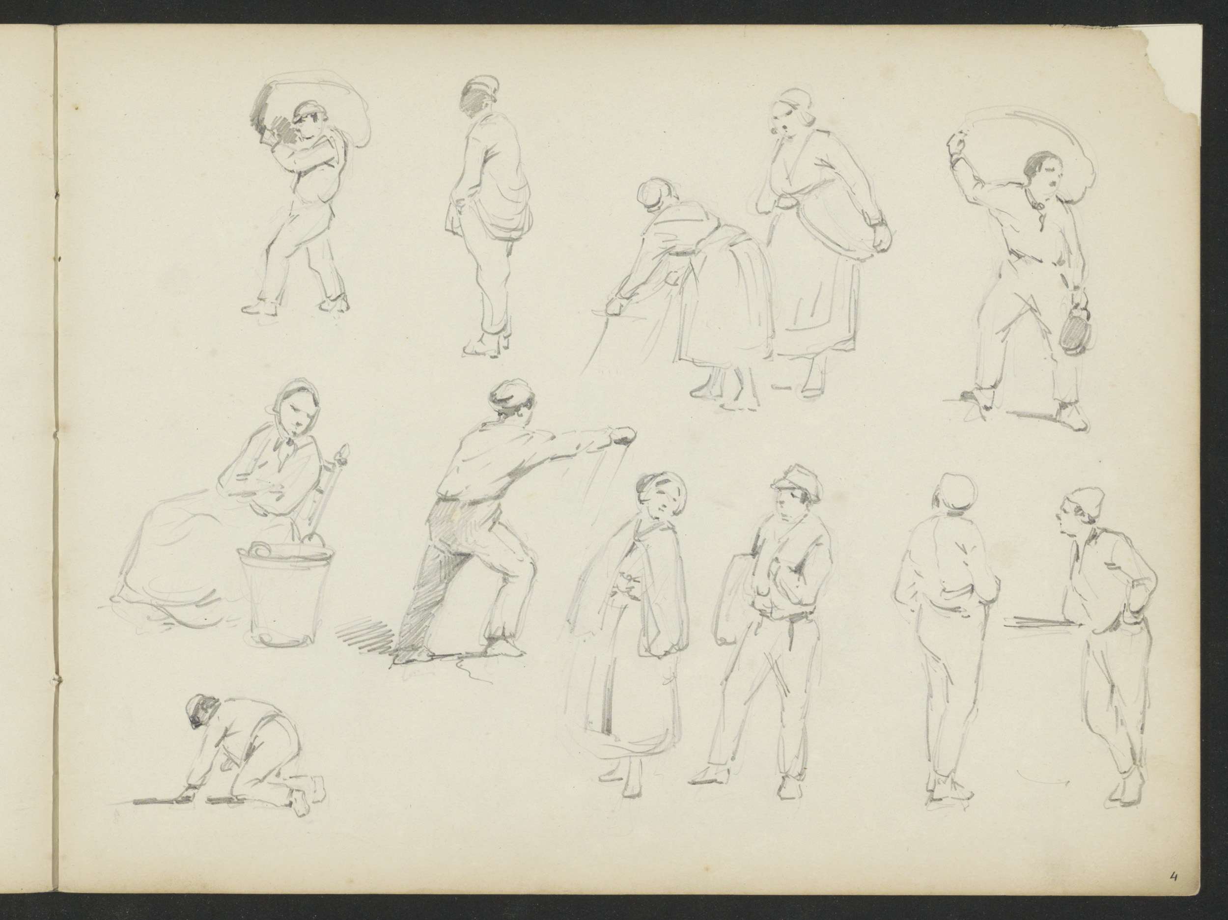 Studieblad met arbeiders, wandelende en spelende fig...