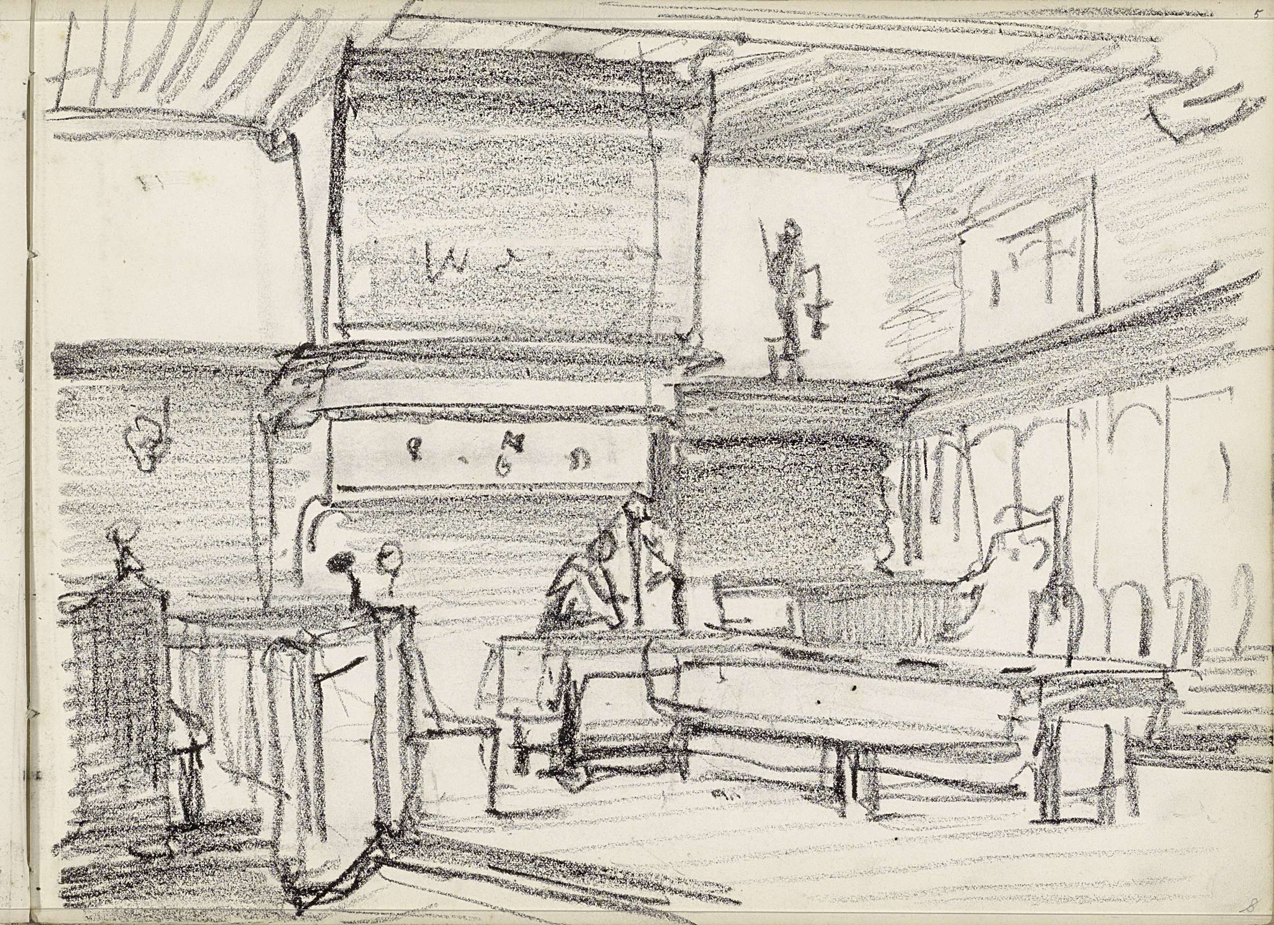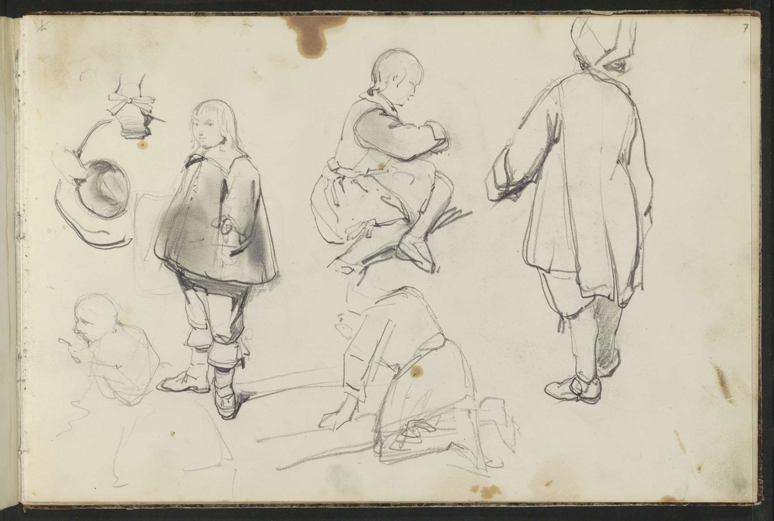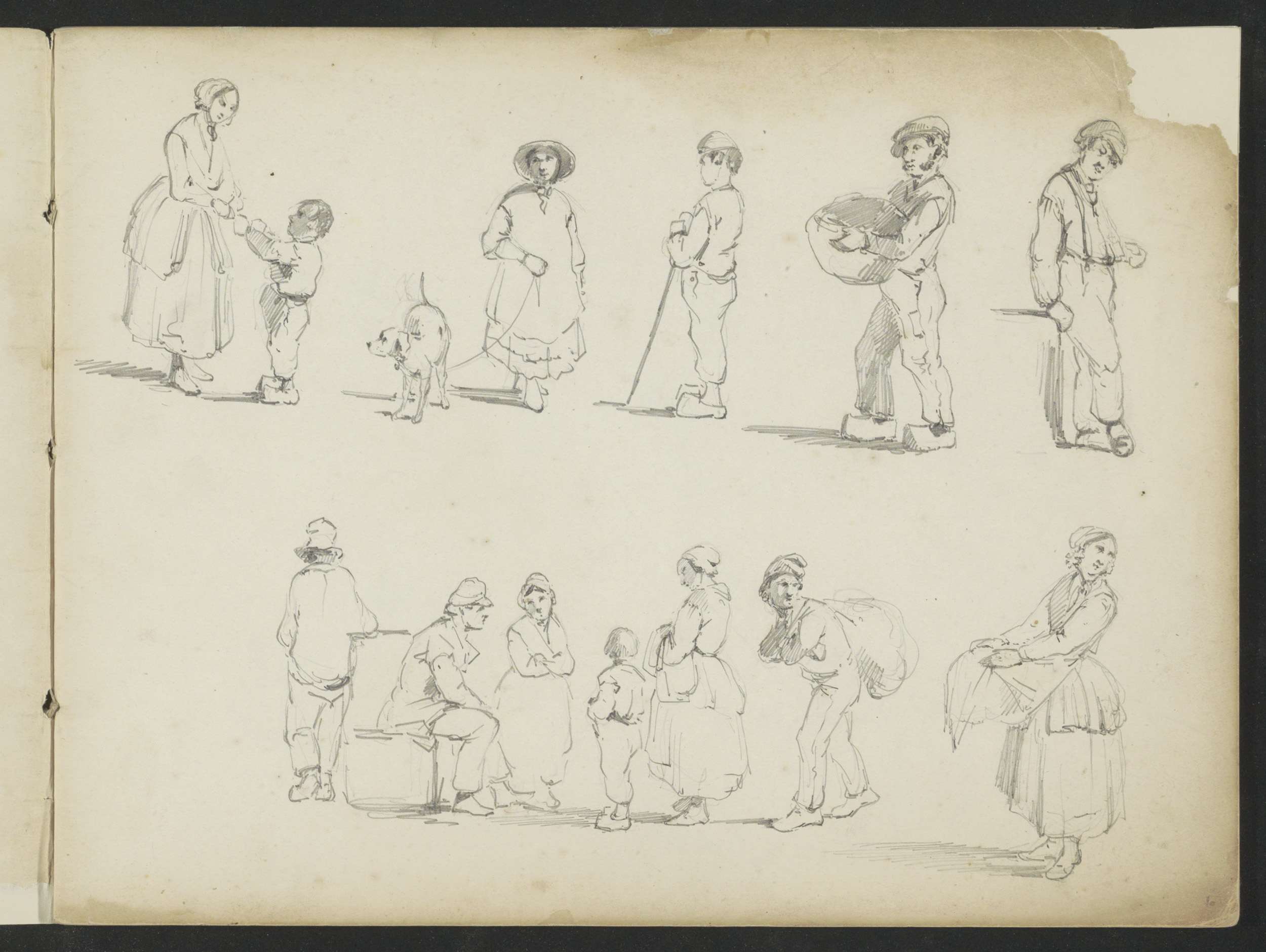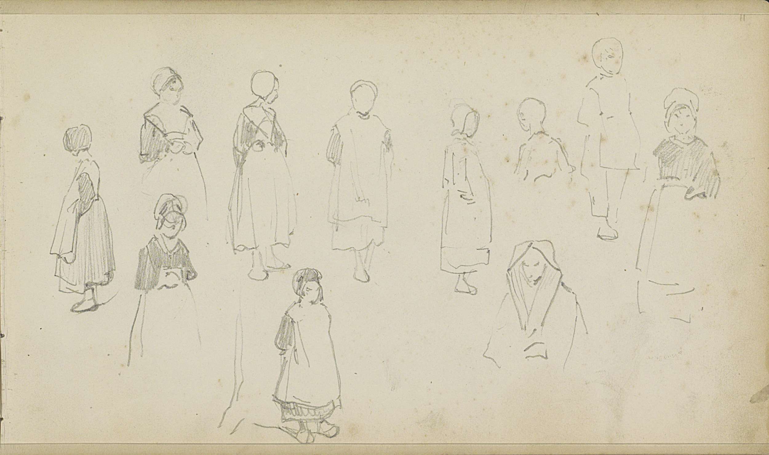 Studieblad met arbeiders, wandelende en spelende fig...