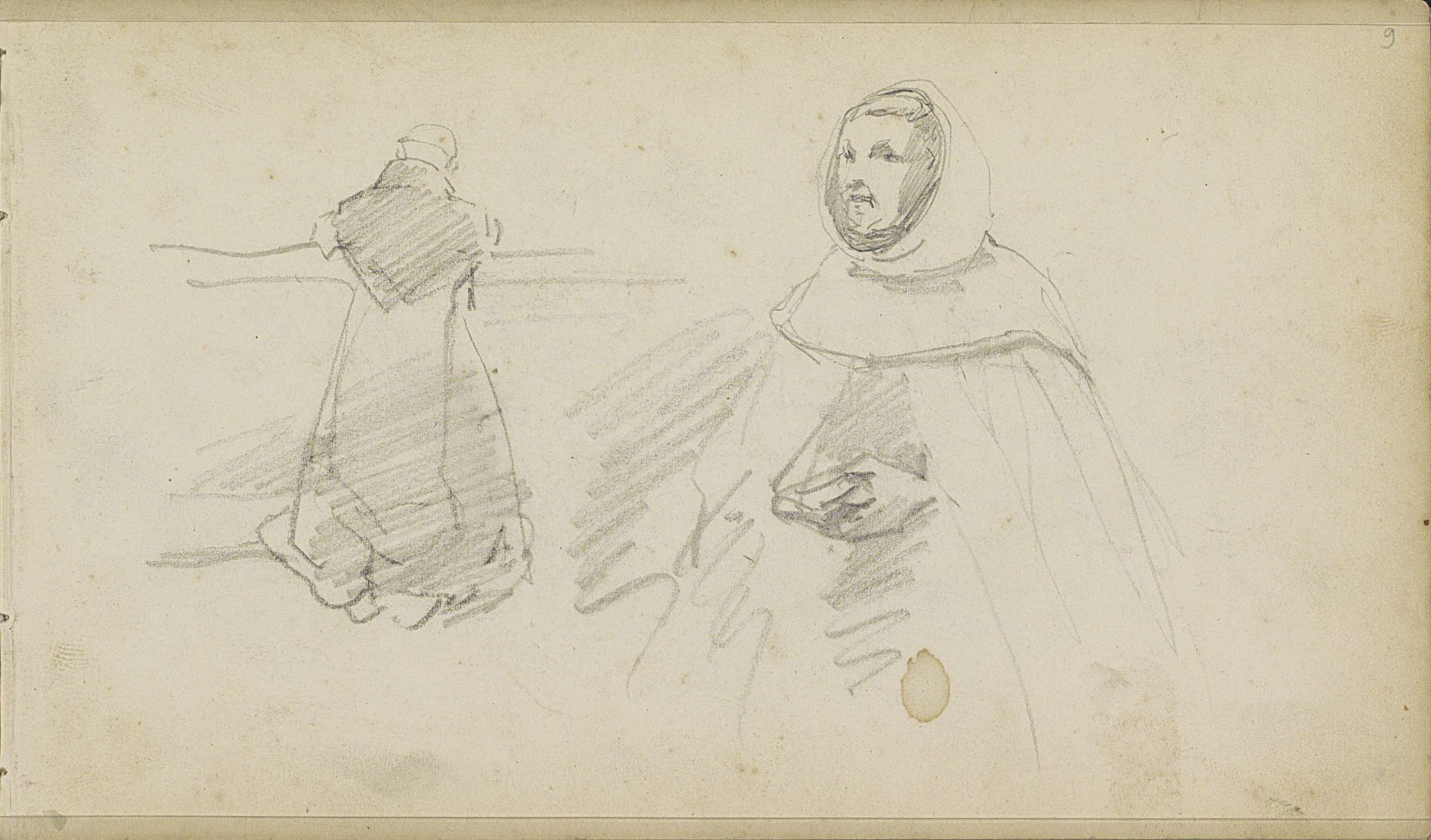 Monnik leunend op een muur en een monnik met ineenge...