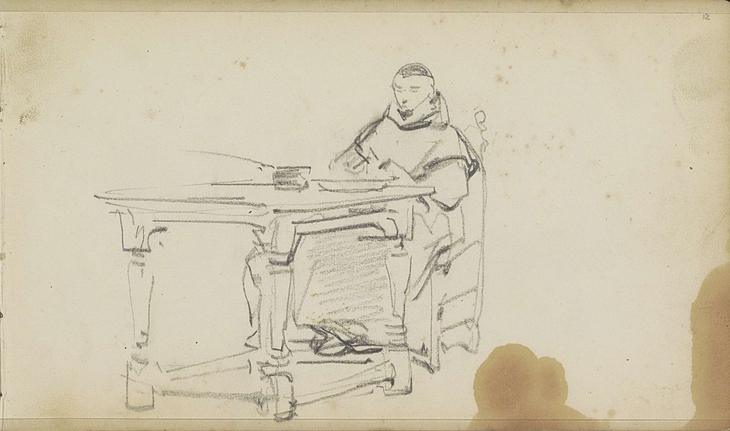 Monnik zittend achter een vierkante tafel