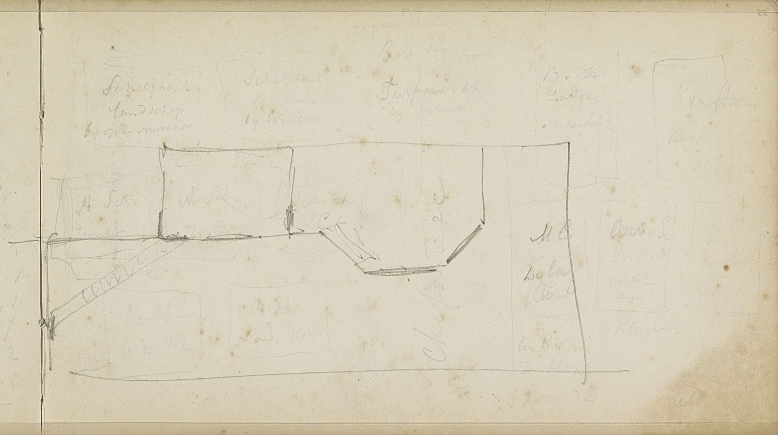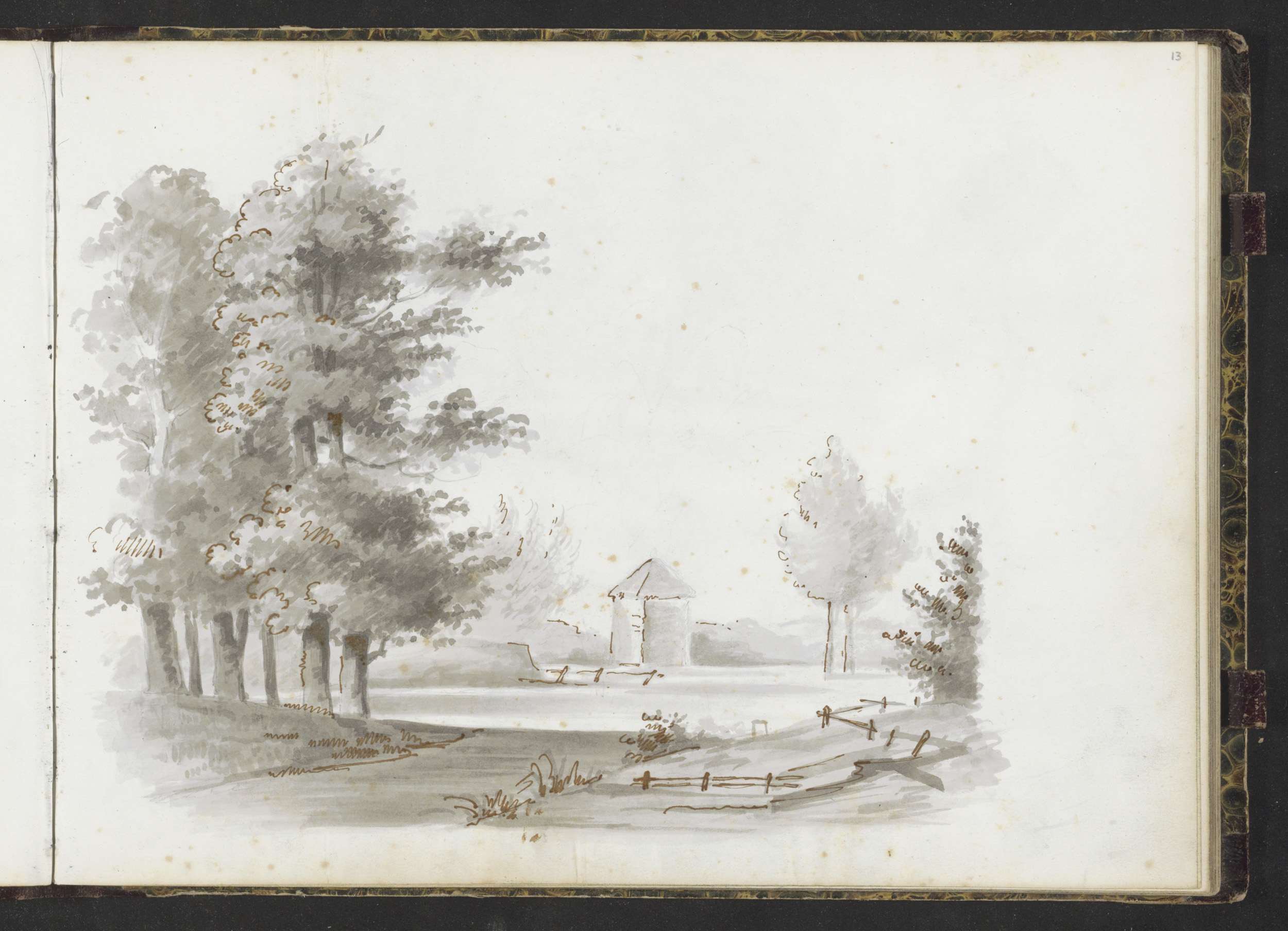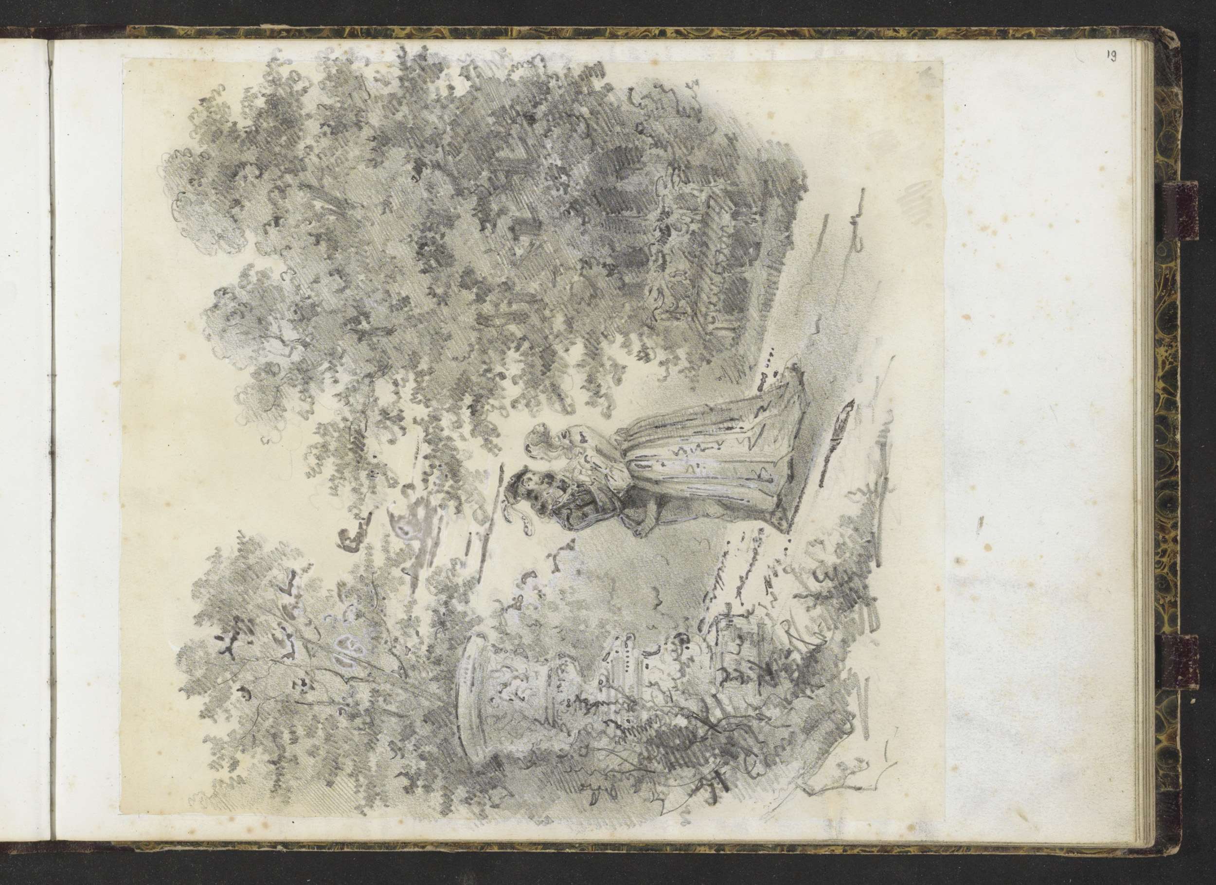 Studieblad met bomen, figuren en karikaturale scènes