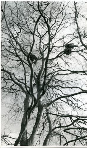 Foto in zwart-wit van een beukenboom met twee nesten...