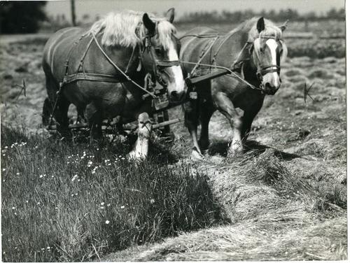 Foto in zwart-wit van twee Belgische paarden voor ee...