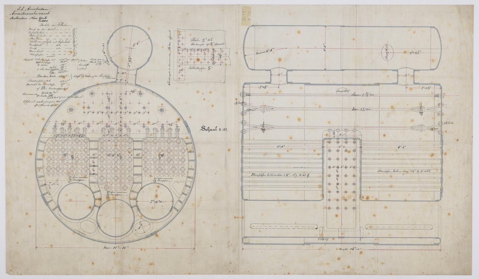 Dwarsdoorsnede en zijaanzicht van stoommotor voor ss...
