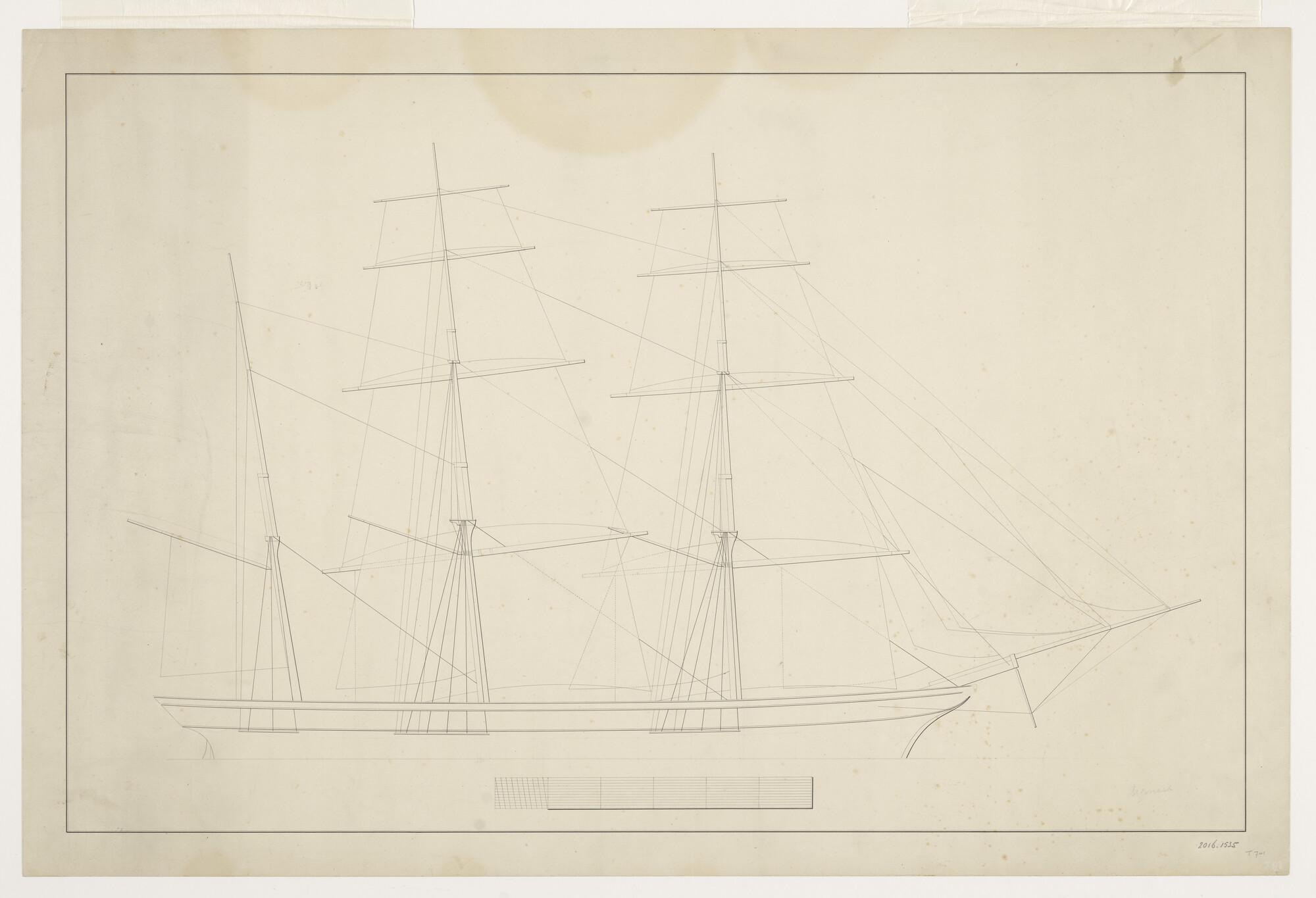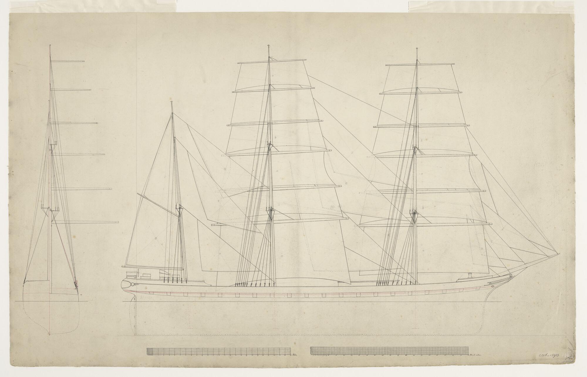 Tuig- en zeilplan van de driemastbark Argonaut van 3...