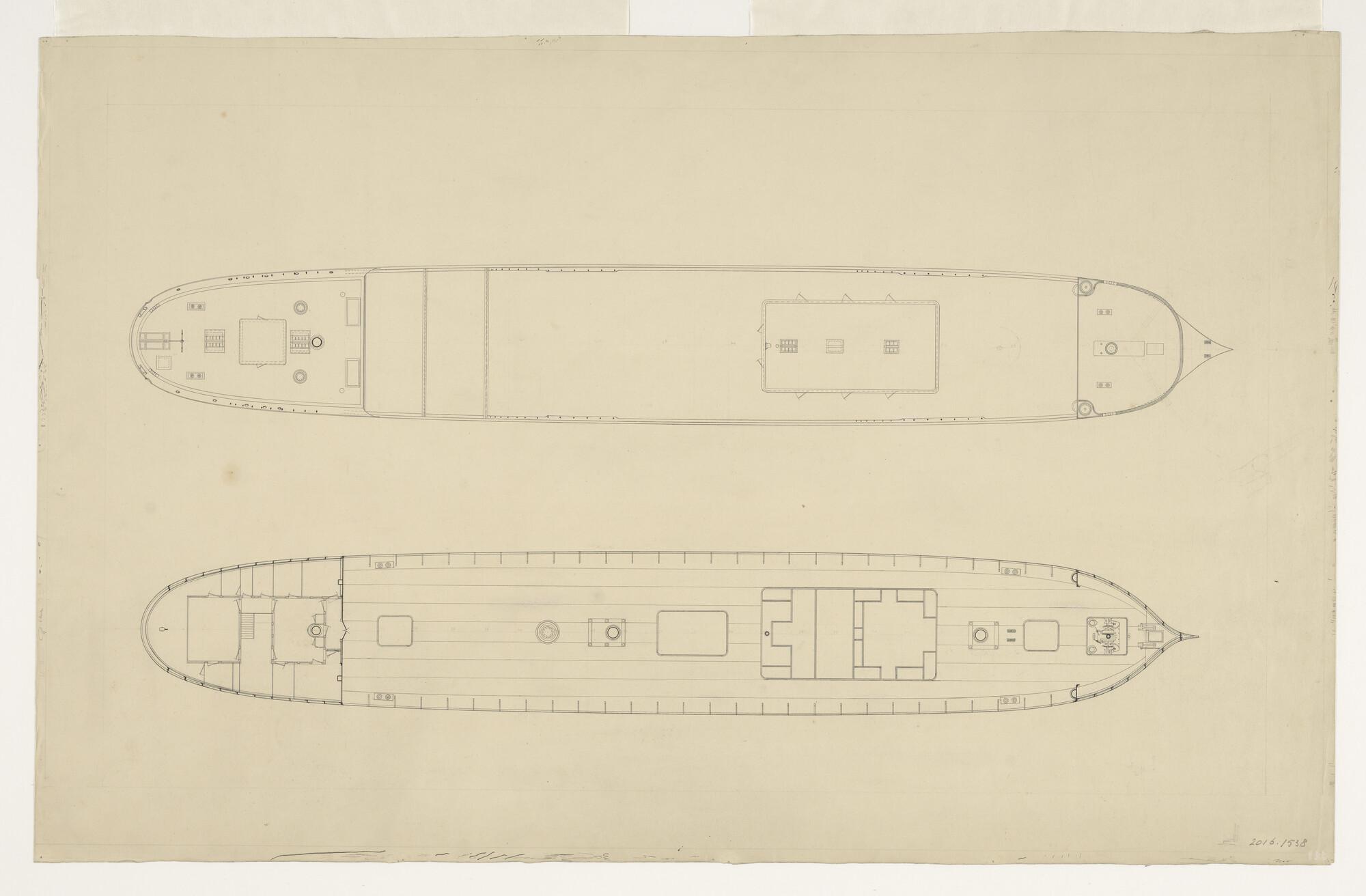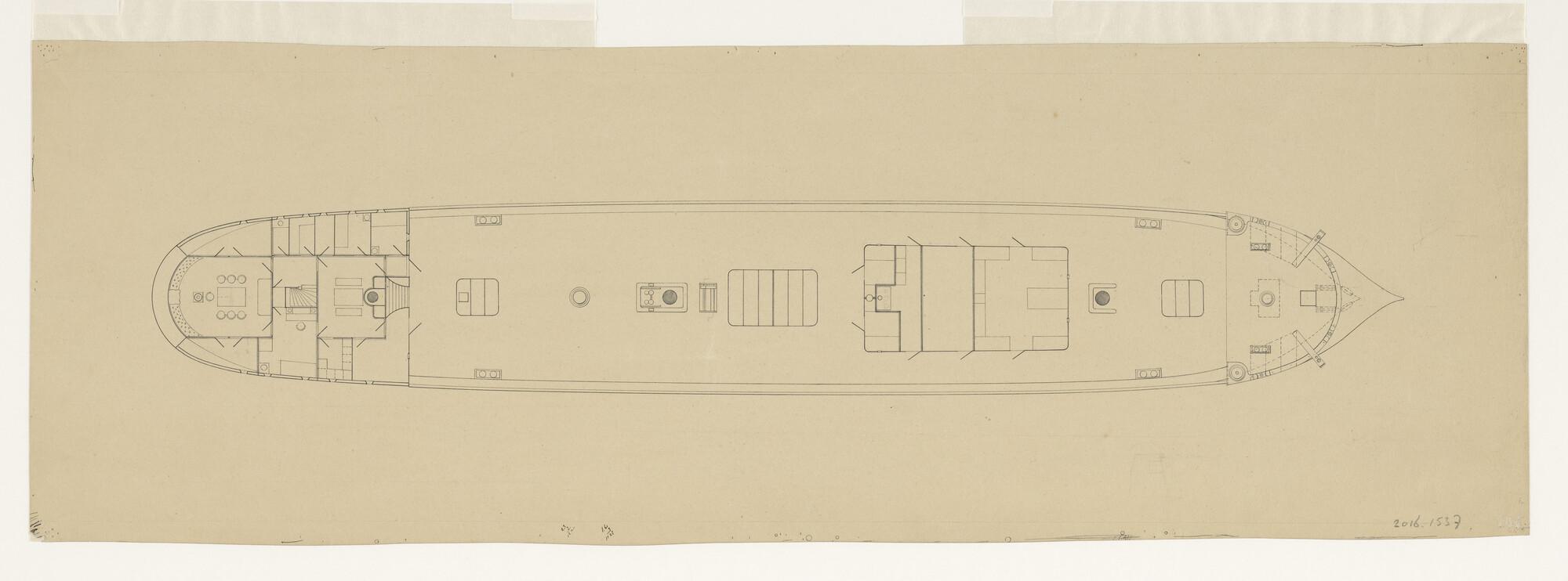 Bovenaanzicht en indeling hoofddek van het barkschip...
