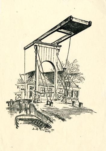 Een lithografie van het Vliet en de Vlietsterbrug in...