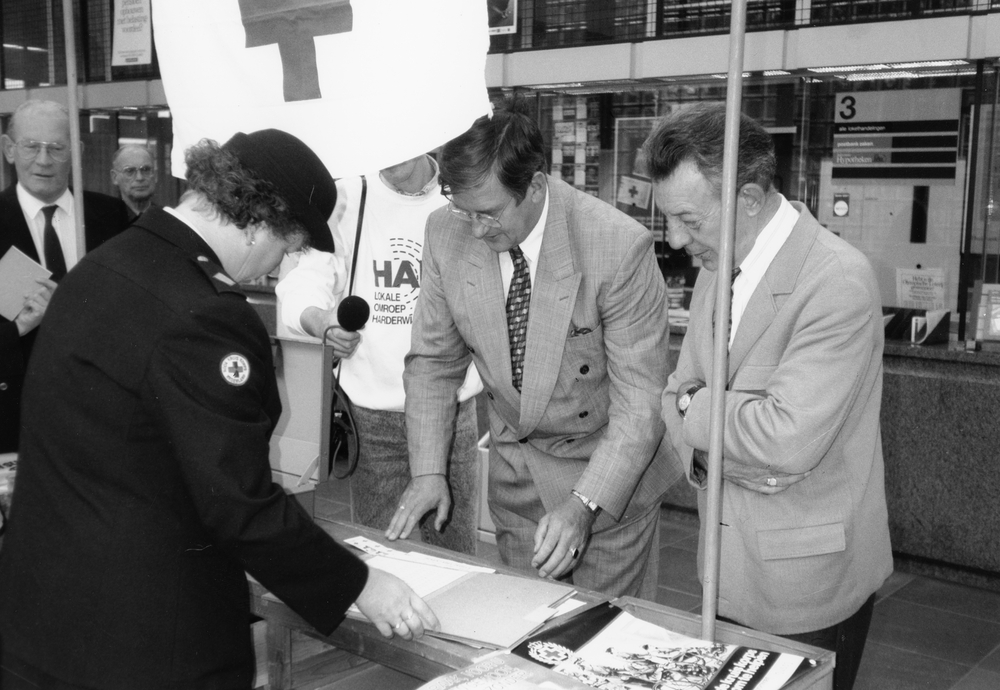 Burgemeester De Groot koopt eerste jubileumpostzegel...