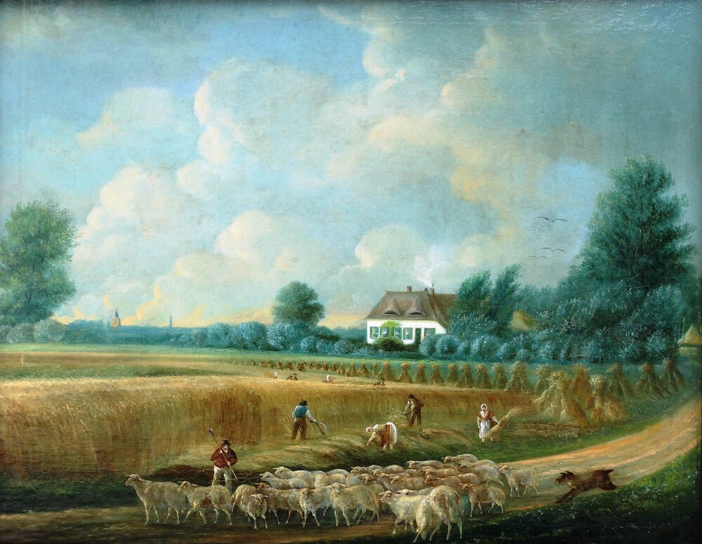 Boerderij met maaiers en schapen, omgeving Reuversweerd