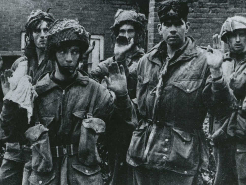 Foto van vijf/5 Britse parachutisten in Arnhem die z...