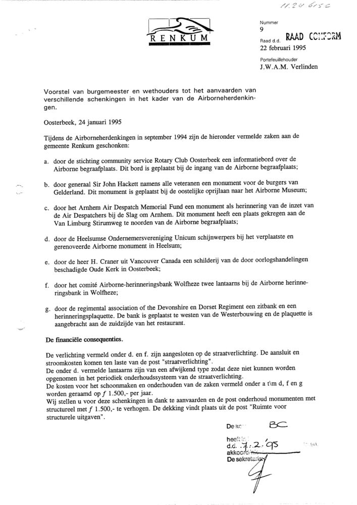 van de gemeente Renkum aan The Arnhem Despatch Memor...