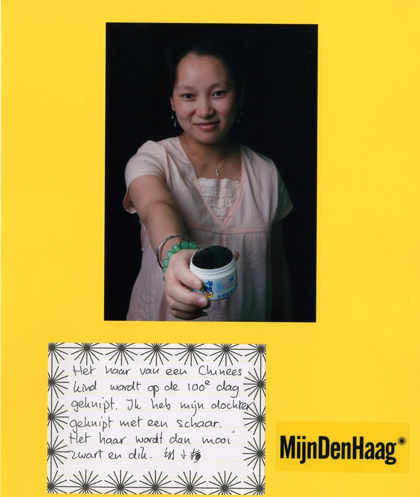 Het topstuk (zwart haar van haar dochter) van Xioa Mei