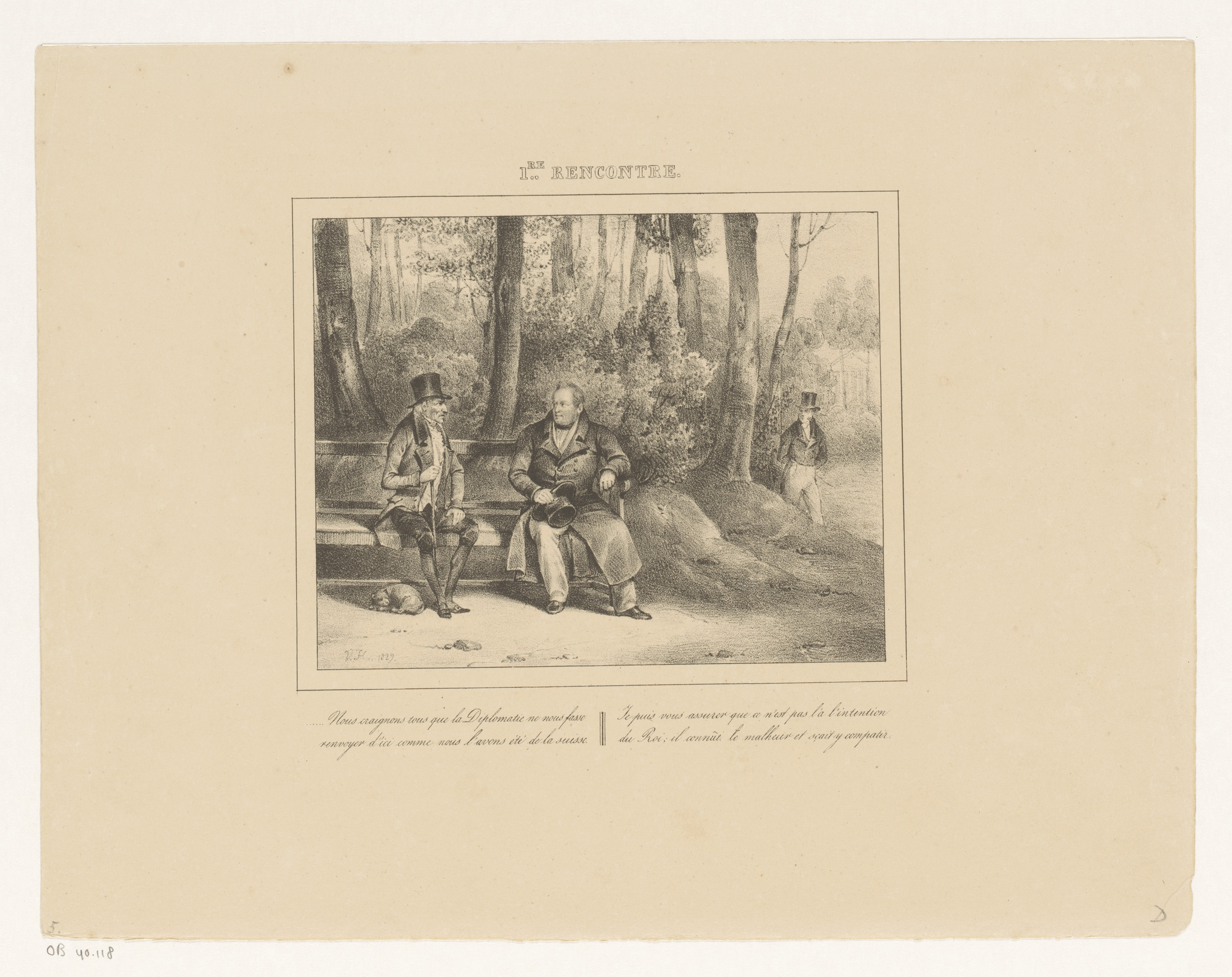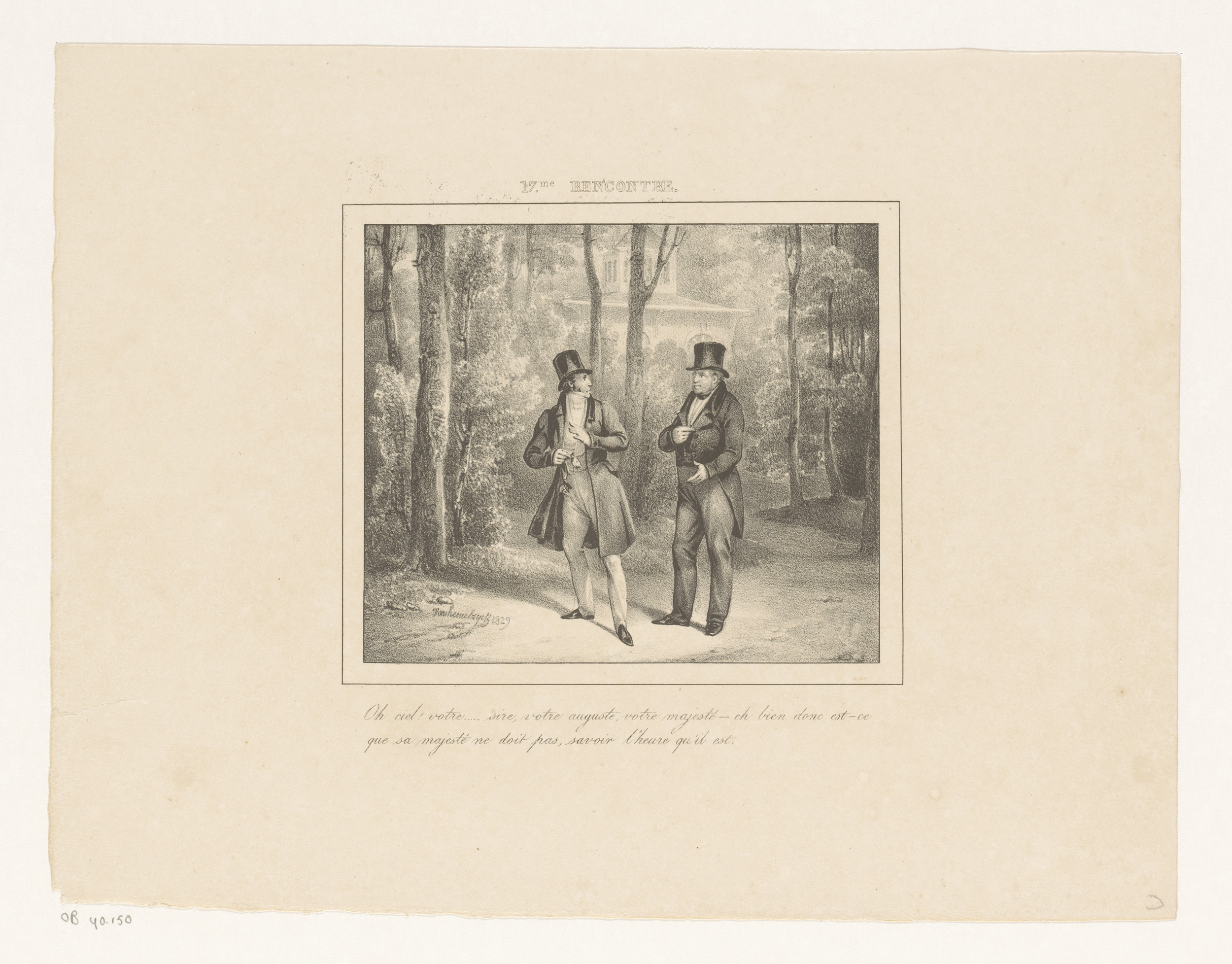Koning Willem I sprekend met een man in het park, 1829