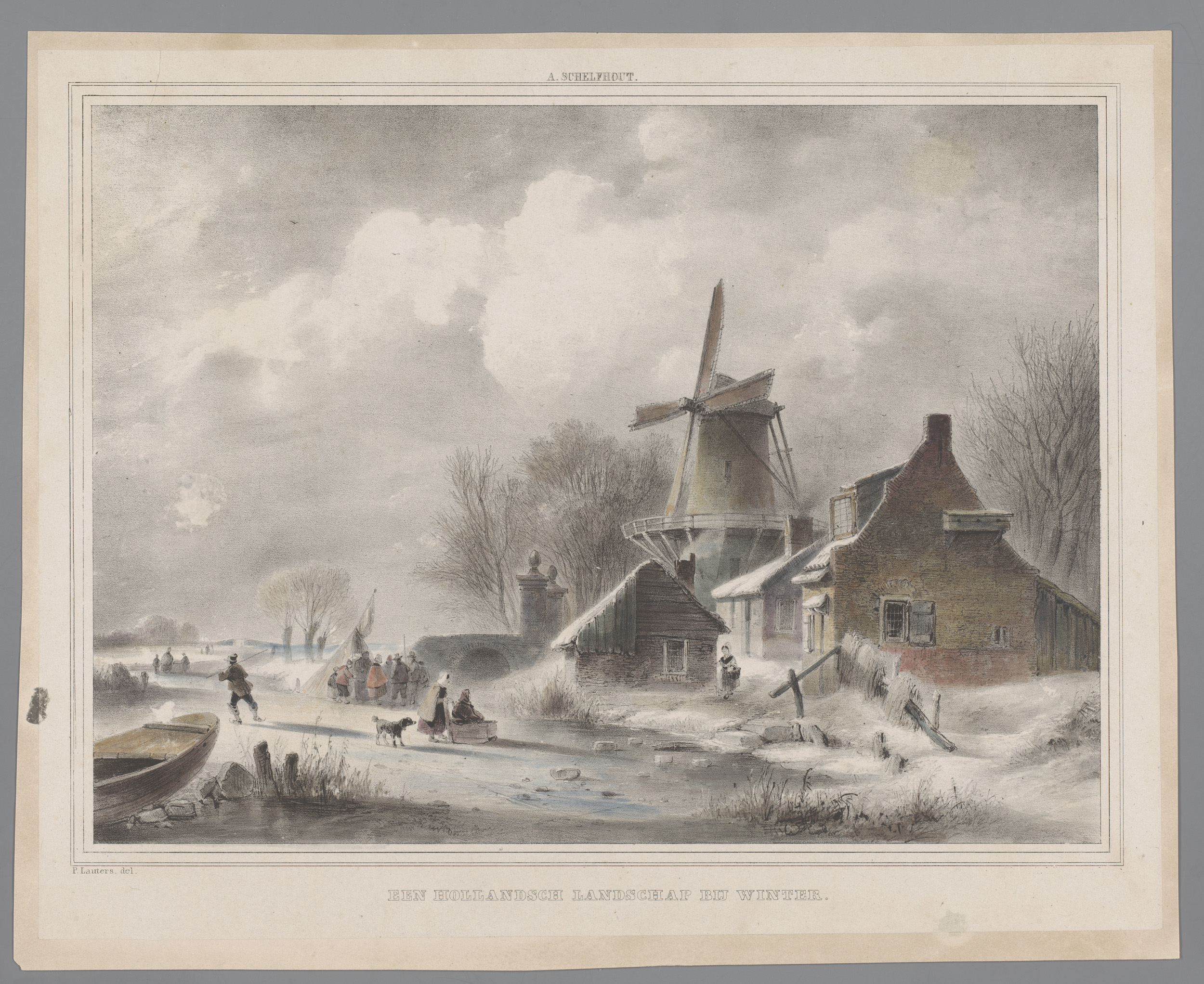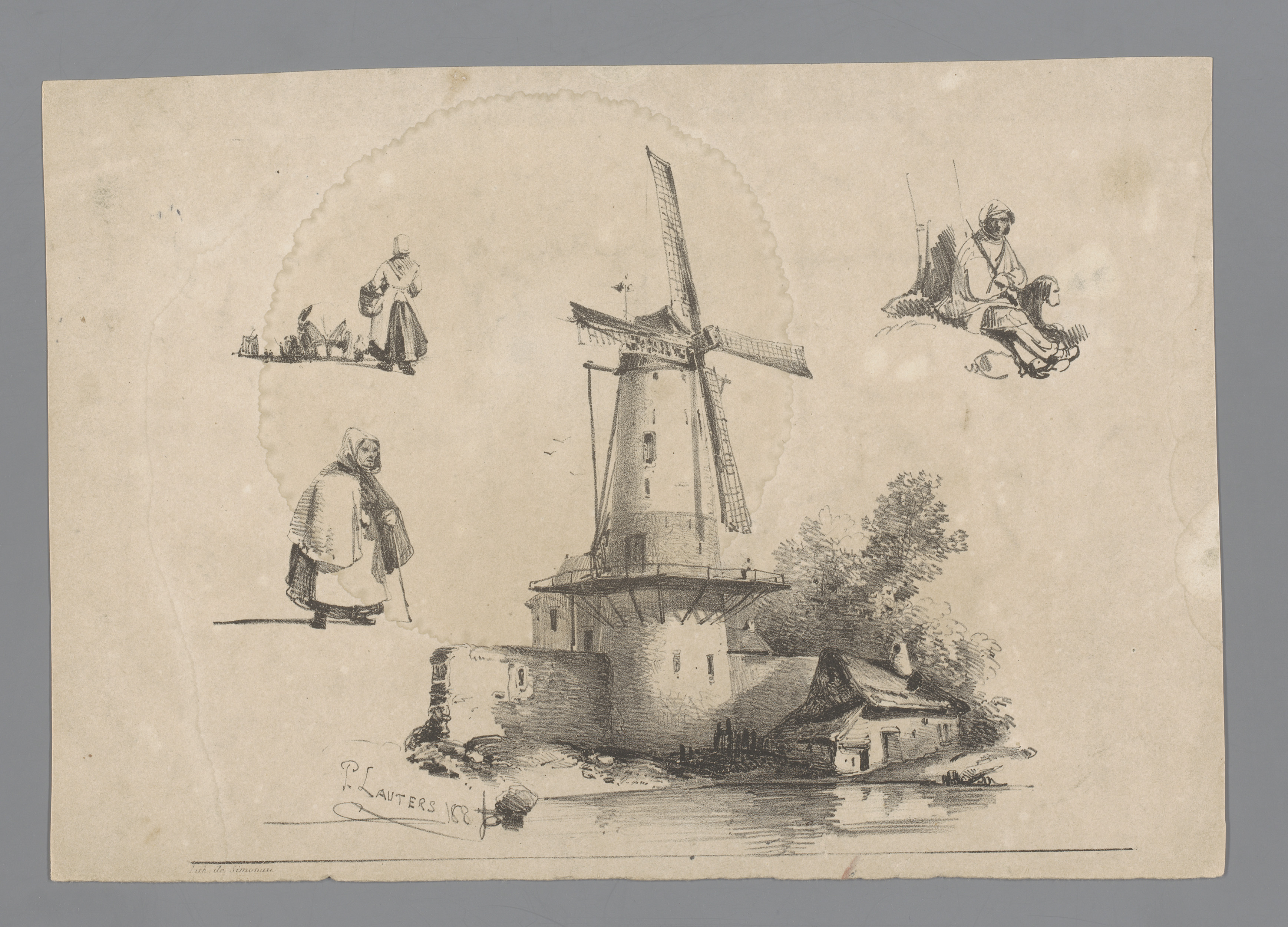 Molen aan het water met rondom drie figuurstudies