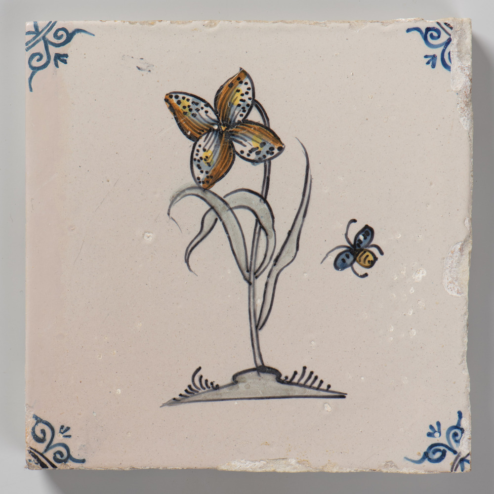 tegel van keramiek met tinglazuur, voorstellende: bl...