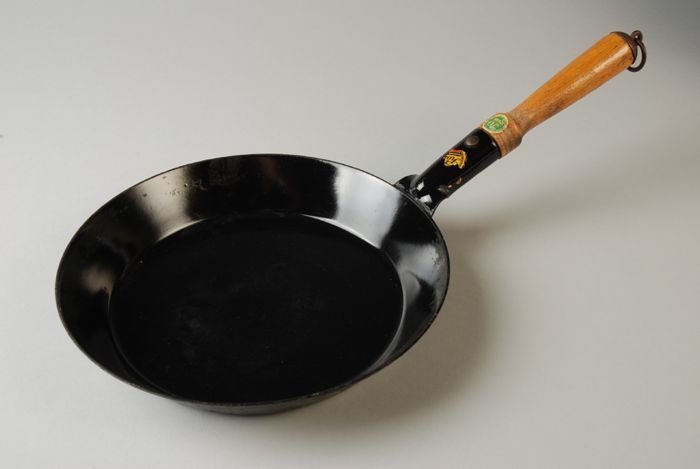 Ronde zwarte steelpan met houten steel ofwel greep m...