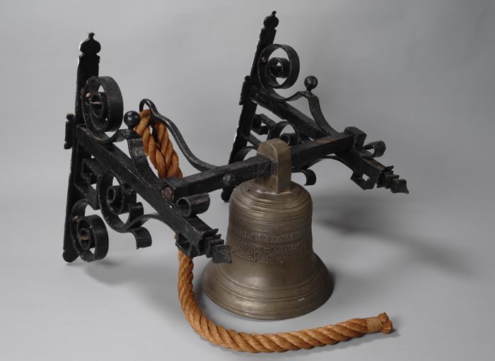 Luiklok met luidbalk, hefboom met touw en twee smeed...