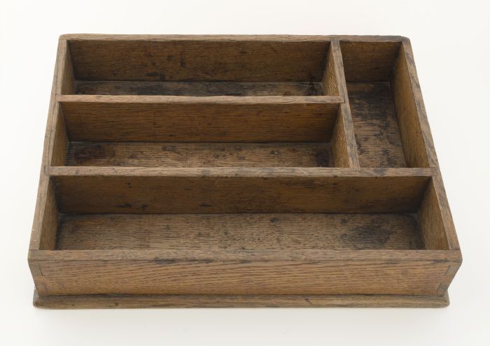 Houten bestekbak met drie liggende vakken en één sta...