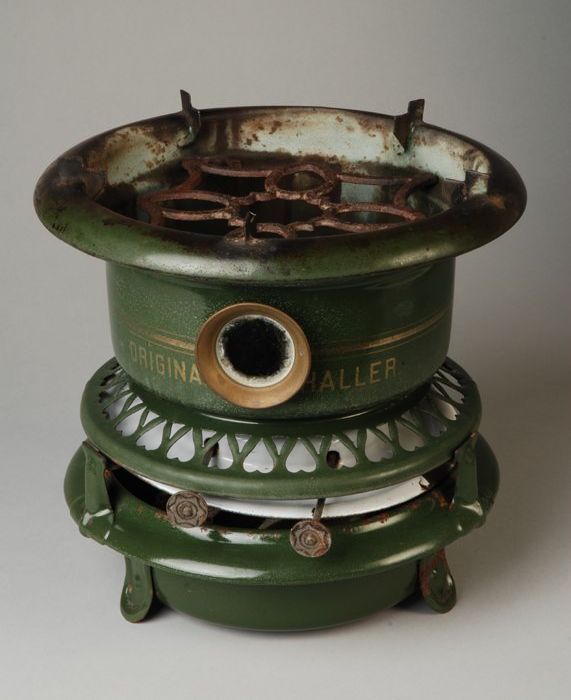 Olijfgroen petroleumstel, merk "Haller", schotel waa...