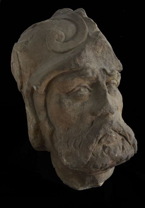 Stenen hoofd van een krijgsman met snor, baard en helm