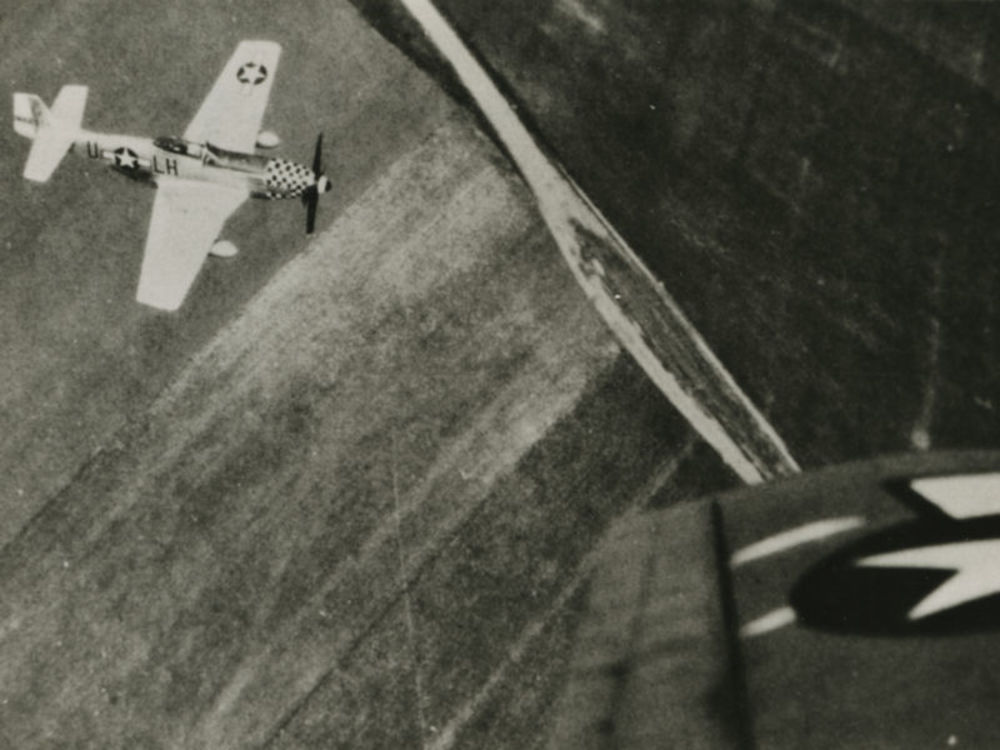 Foto van vliegend Amerikaans P-51 D Mustang jachtvli...